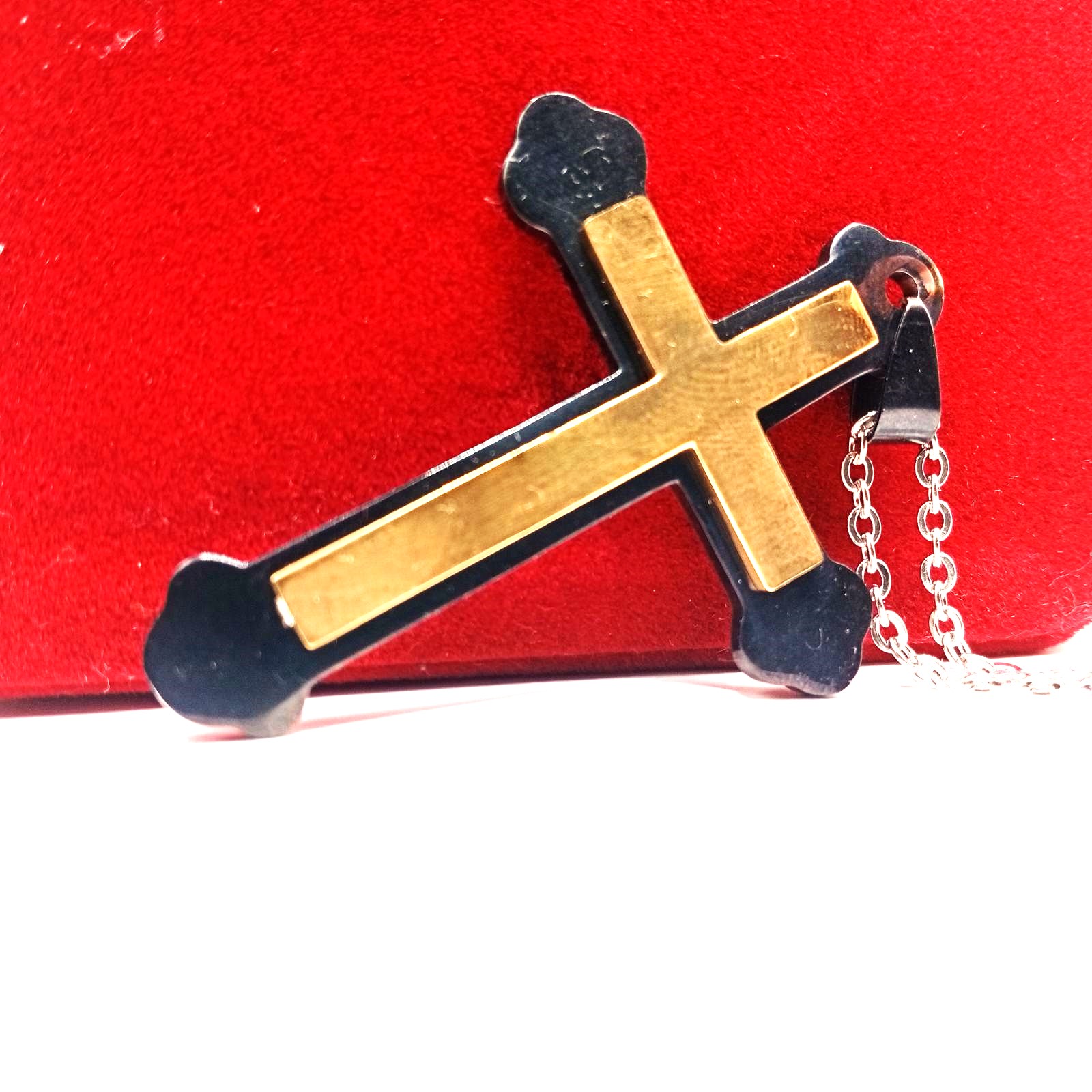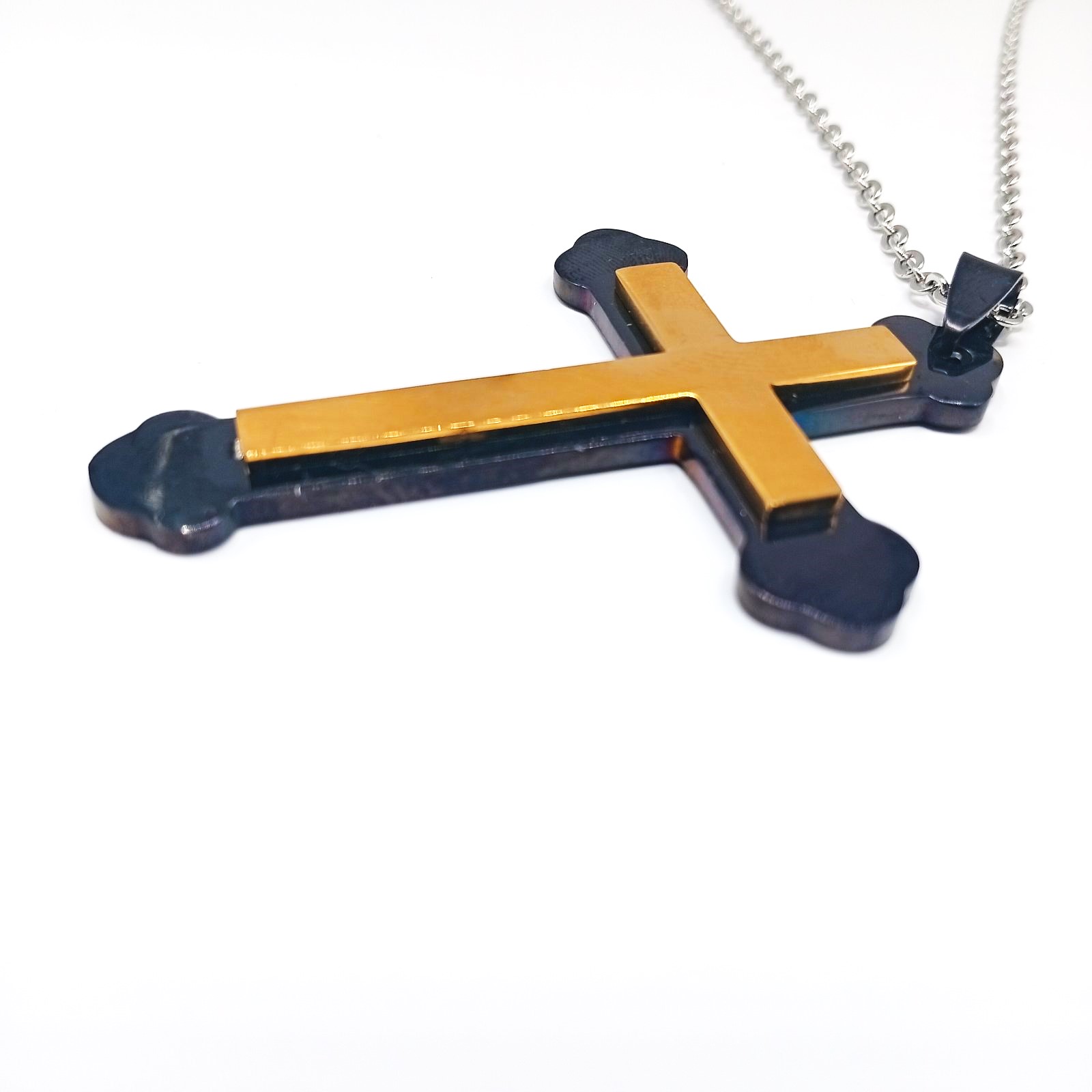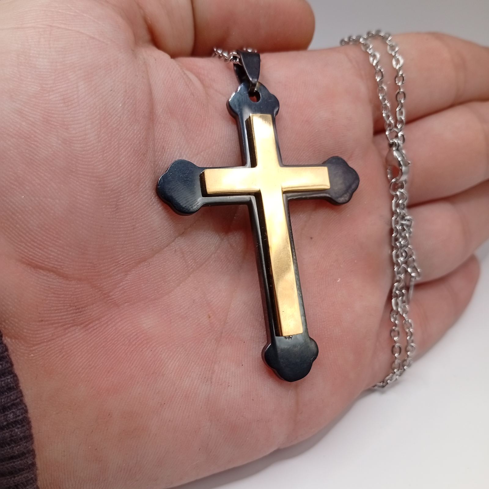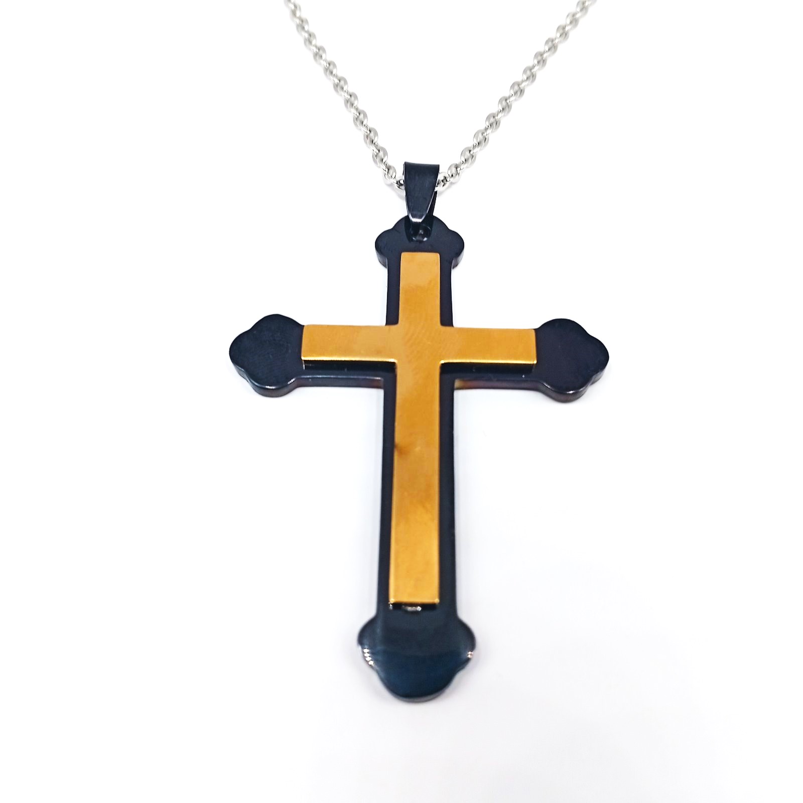 Το σώμα του σταυρού διαθέτει μαύρη γυαλιστερή βάση με χρυσή επένδυση στο κέντρο, προσφέροντας αντίθεση που αναδεικνύει τον σχεδιασμό του. Κατασκευασμένος από υψηλής ποιότητας ανοξείδωτο ατσάλι, παραμένει αναλλοίωτος με την πάροδο του χρόνου, δεν μαυρίζει και δεν προκαλεί αλλεργίες. Είναι ανθεκτικός στην καθημερινή χρήση, διατηρώντας τη λάμψη και τη γοητεία του.