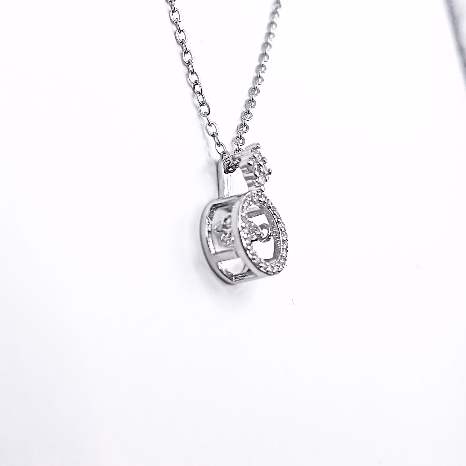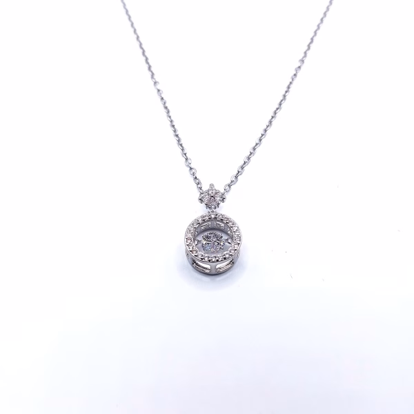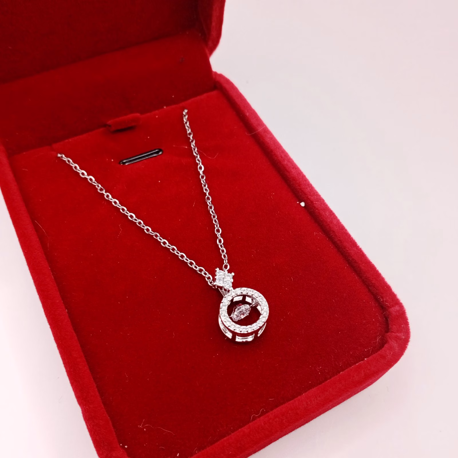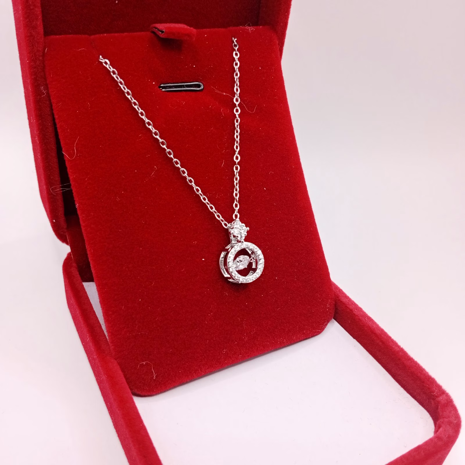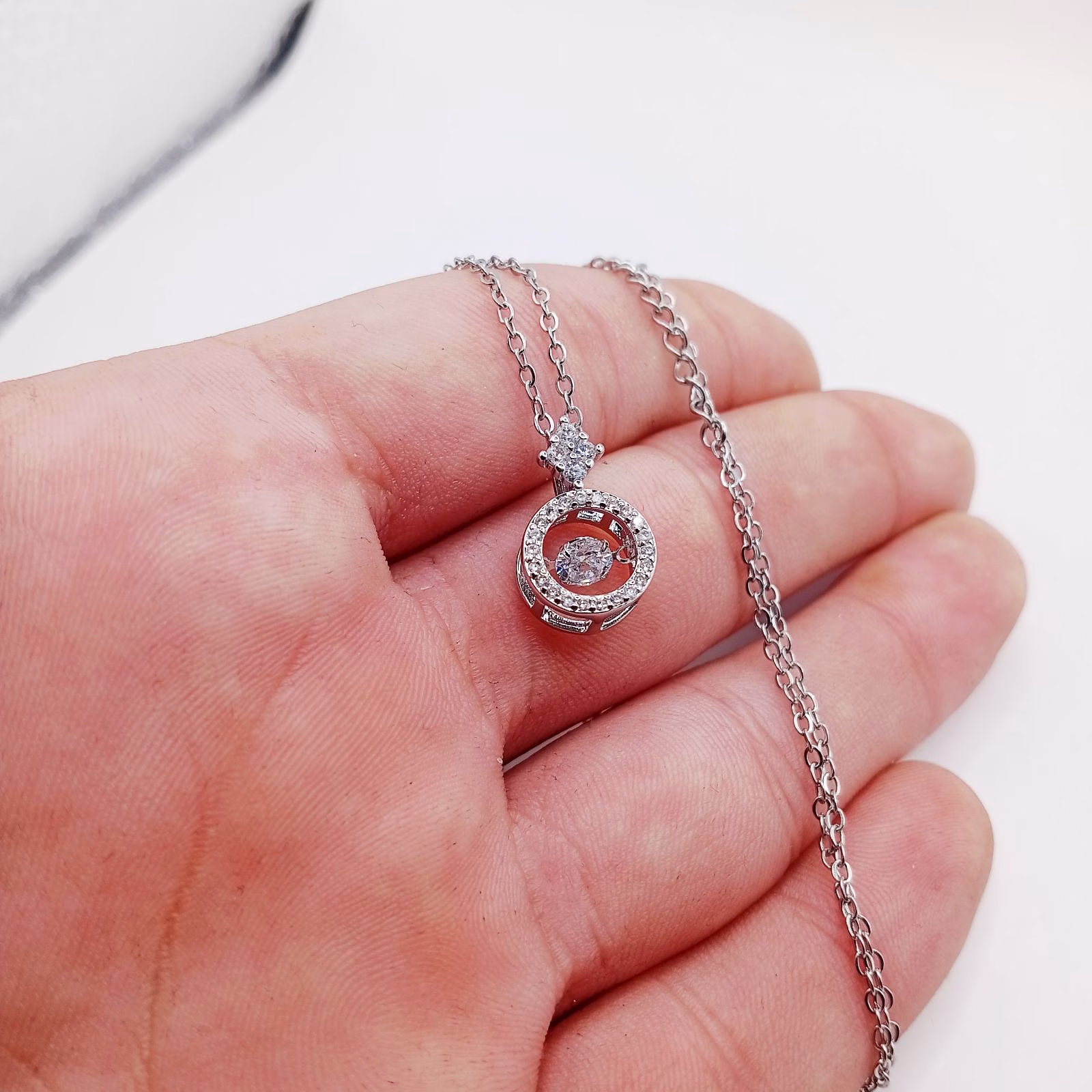 Αυτό το ασημένιο κολιέ 925 ξεχωρίζει για τον κομψό, κυκλικό του σχεδιασμό και τη λαμπερή του παρουσία. Το μοτίφ σχηματίζει έναν διακριτικό κύκλο, διακοσμημένο περιμετρικά με λευκές πέτρες , ενώ στο κέντρο του δεσπόζει μια πέτρα που κινείται ελαφρά, δημιουργώντας ένα εντυπωσιακό παιχνίδι φωτός σε κάθε κίνηση.