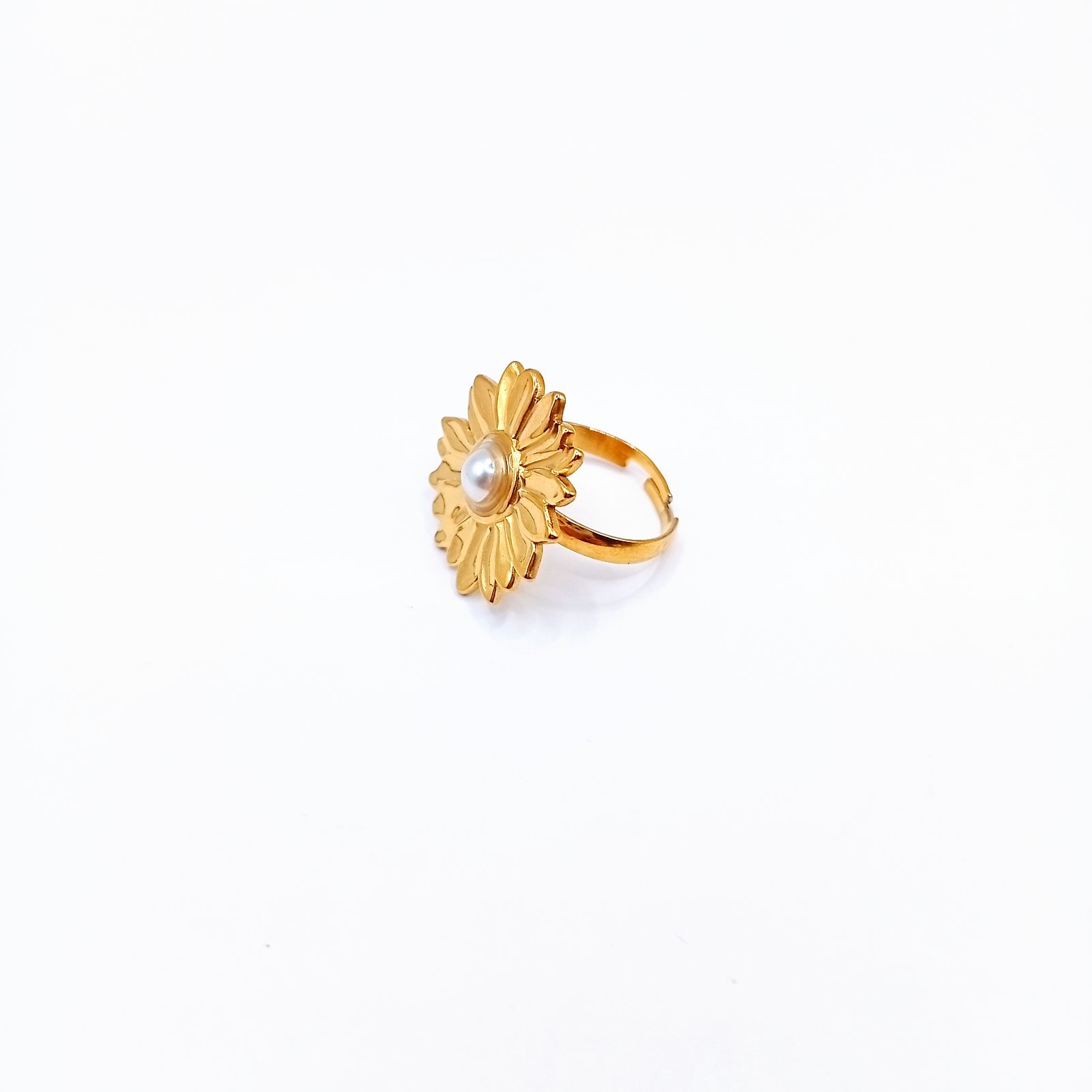 Το ατσάλινο δαχτυλίδι Flower Pearl είναι μια statement επιλογή που ξεχωρίζει χάρη στη λεπτομερή ανάγλυφη σχεδίαση των πετάλων και την κεντρική πέρλα που δίνει μια elegant πινελιά. Η χρυσή επιφάνεια απογειώνει το σχέδιο και το κάνει ιδανικό για όσες θέλουν να προσθέσουν έναν πιο λαμπερό και ρομαντικό τόνο στο look τους.