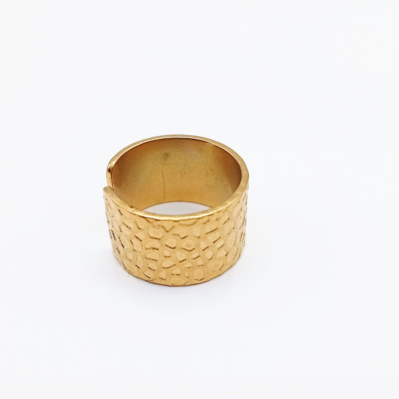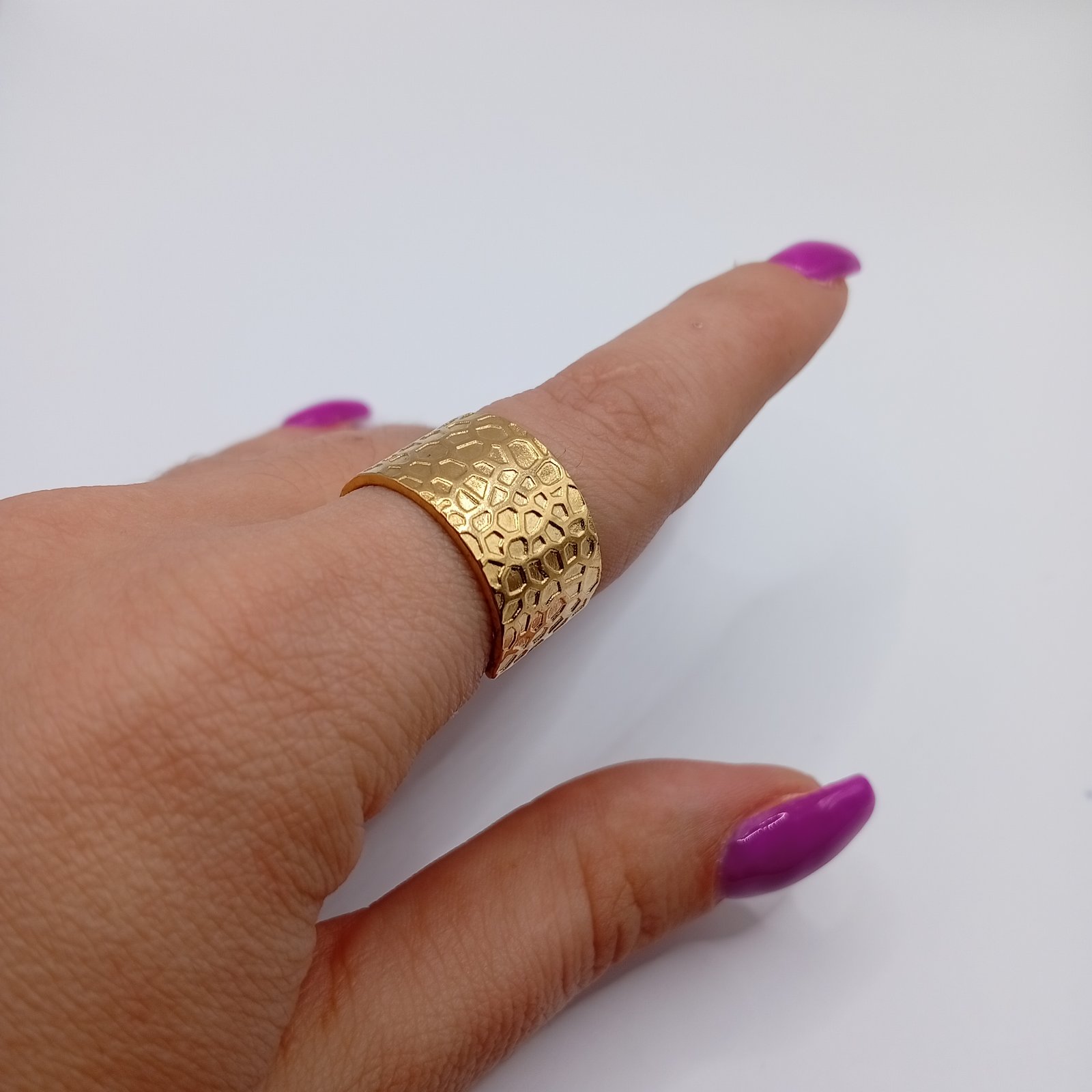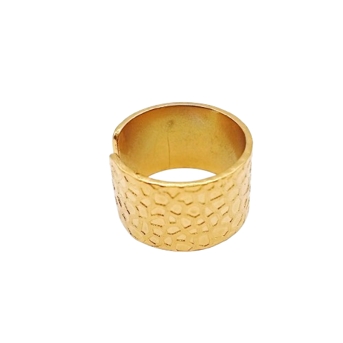 Το ατσάλινο δαχτυλίδι Gold Texture είναι ένα statement κόσμημα που τραβά το βλέμμα χάρη στην ανάγλυφη επιφάνειά του. Η textured σχεδίαση δημιουργεί ένα όμορφο παιχνίδι φωτός που δίνει βάθος και premium αισθητική, κάνοντάς το ιδανικό για γυναίκες που αγαπούν μοντέρνα γυναικεία δαχτυλίδια με χαρακτήρα. Η φαρδιά επιφάνεια προσφέρει ισορροπία στο χέρι και ταιριάζει σε minimal αλλά και πιο έντονα outfits.