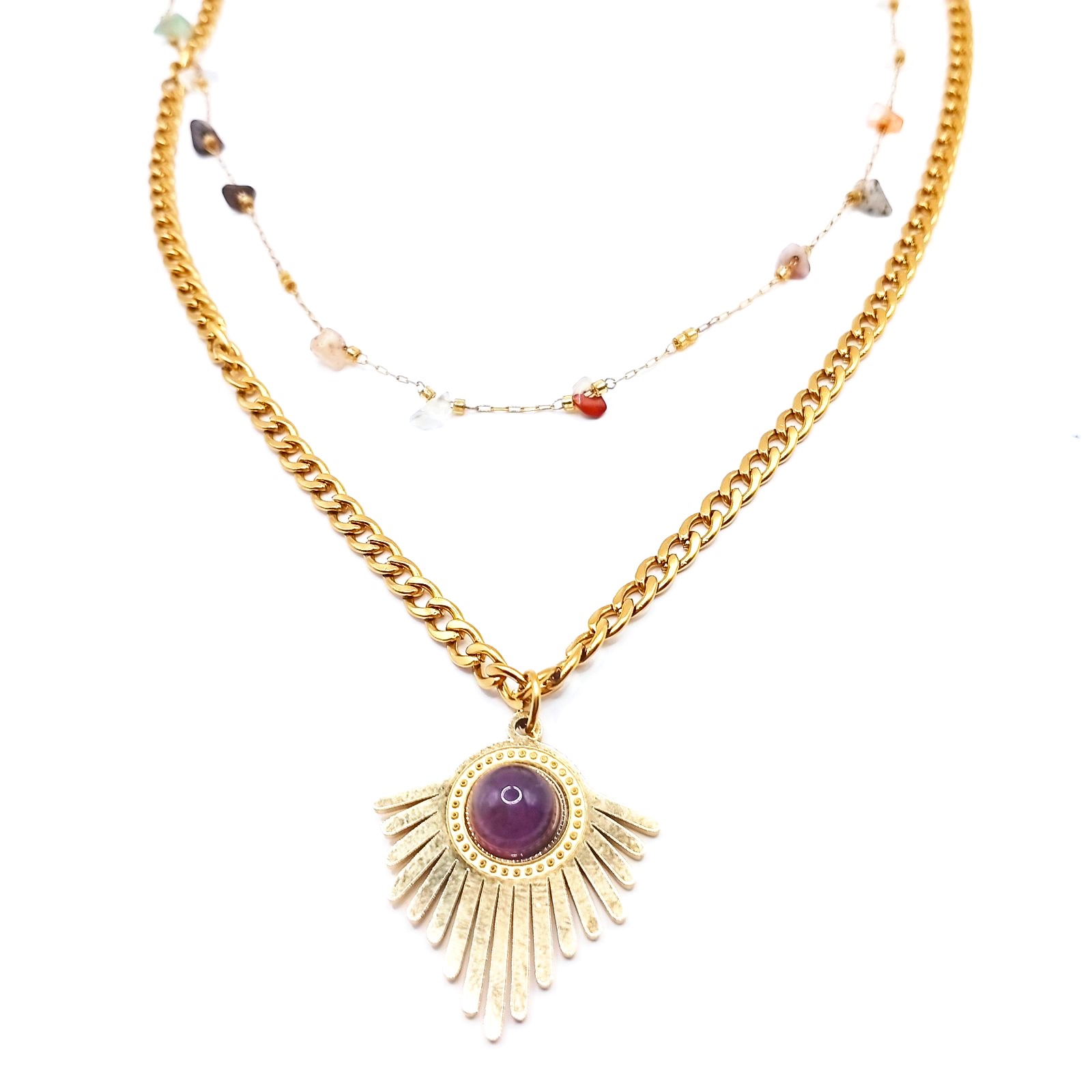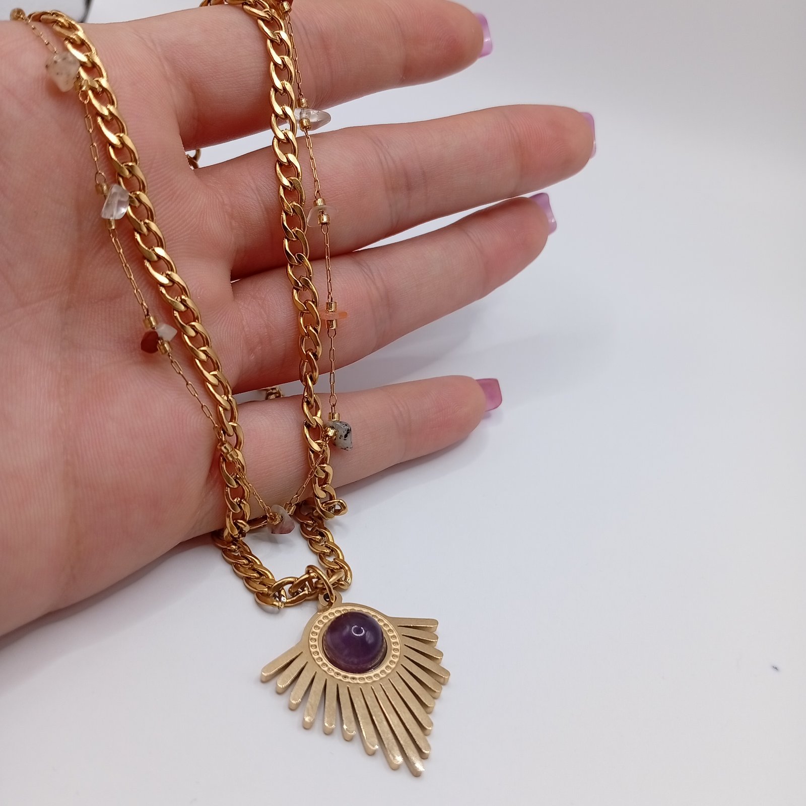 Αναβάθμισε τις εμφανίσεις σου με αυτό το εντυπωσιακό ατσάλινο διπλό επιχρυσωμένο κολιέ με αμέθυστο . Το πρώτο επίπεδο διαθέτει δυνατό, χοντρό chain και εντυπωσιακό μοτίφ με ημιπολύτιμο λίθο αμέθυστο στο κέντρο. Ο αμέθυστος χαρίζει μια κομψή μωβ απόχρωση και προσθέτει μια boho–lux πινελιά που ταιριάζει σε κάθε στυλ.