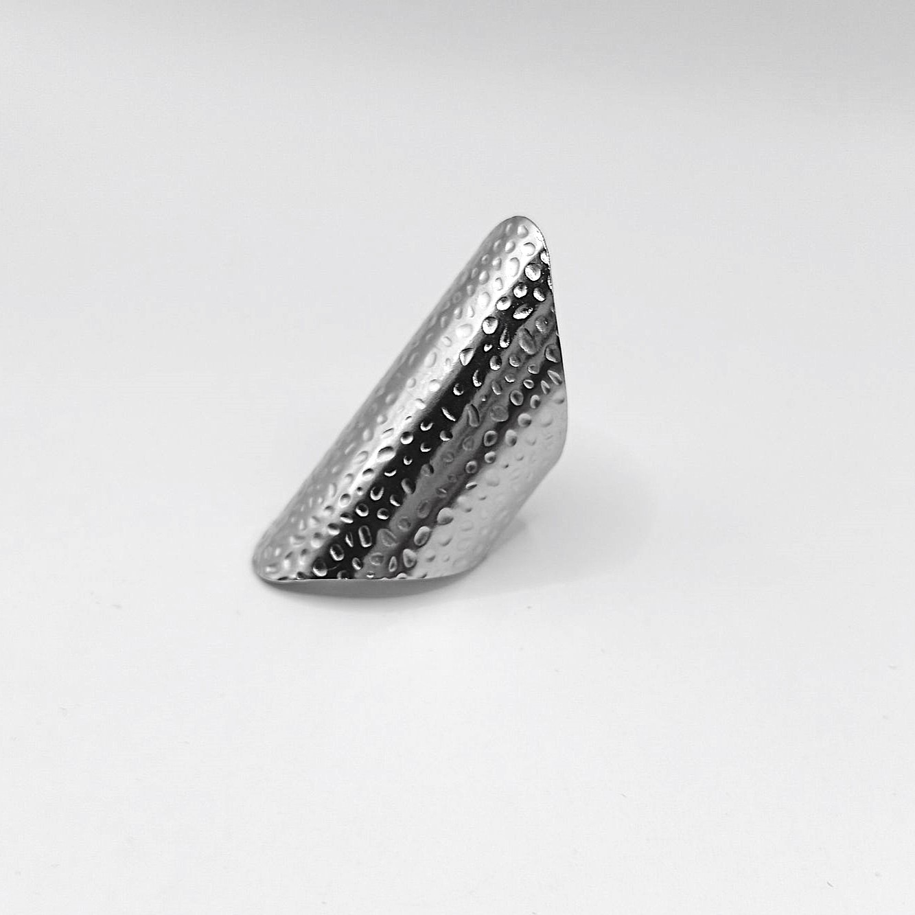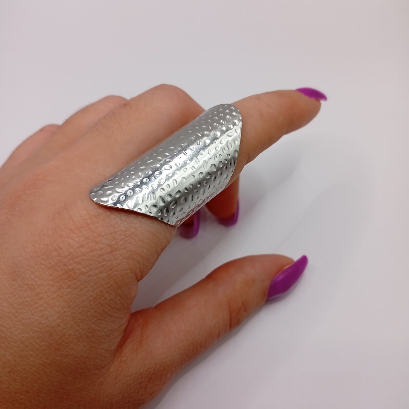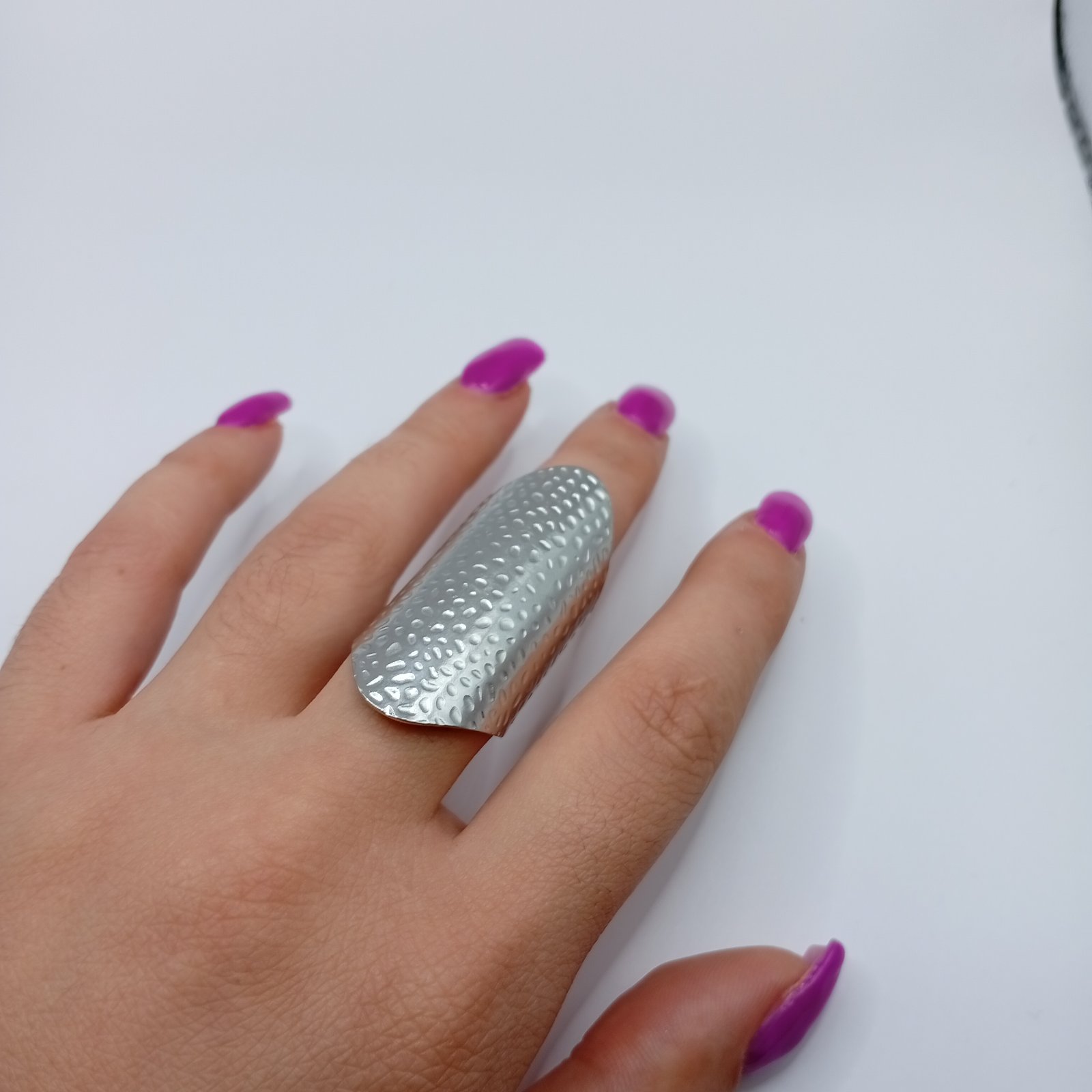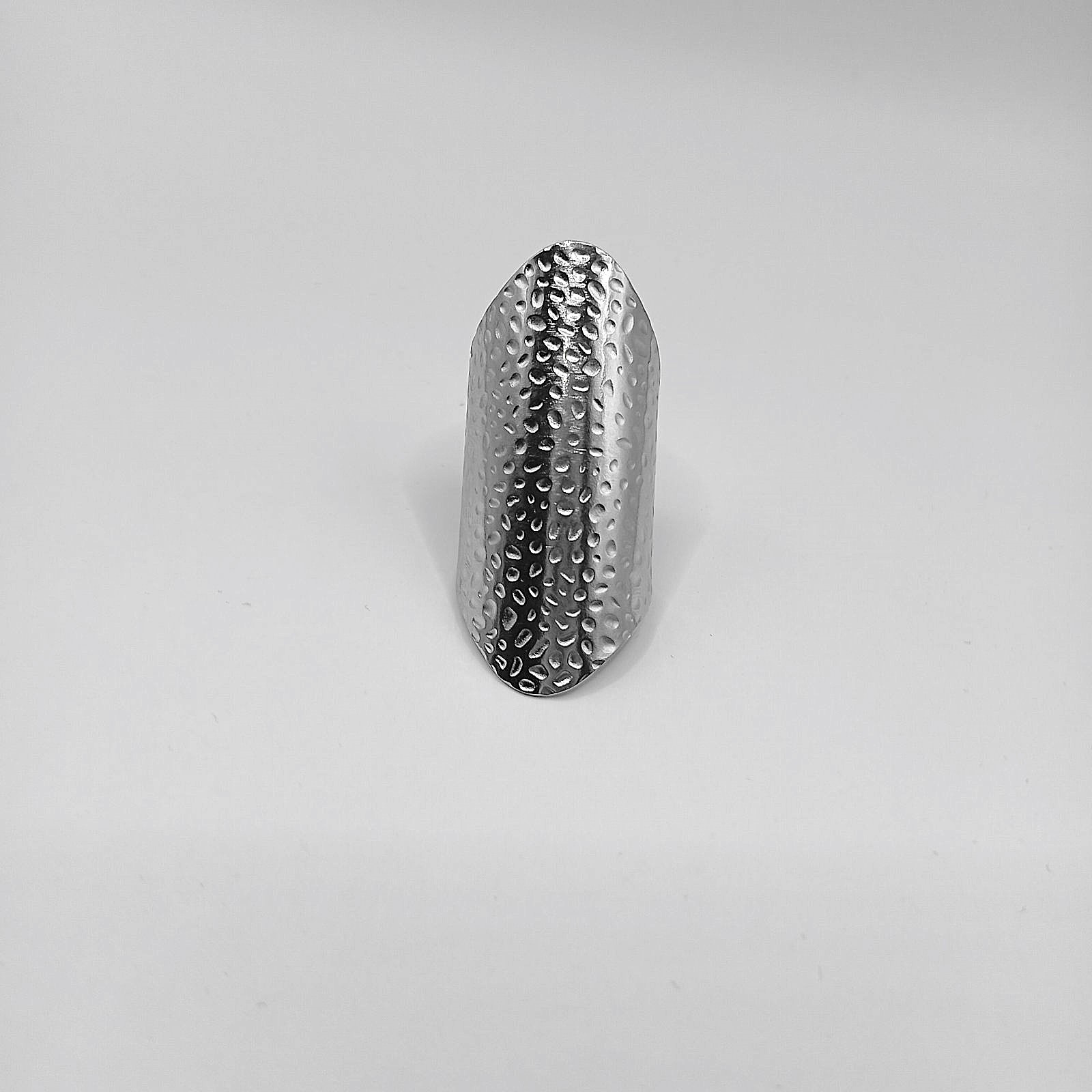 Αυτό το μακρύ hammered δαχτυλίδι από ανοξείδωτο ατσάλι είναι ένα statement κομμάτι που δεν περνάει απαρατήρητο. Η ανάγλυφη υφή του δημιουργεί ένα εντυπωσιακό παιχνίδι φωτός, ενώ το επιμήκες σχήμα του καλύπτει διακριτικά τη ράχη του δαχτύλου, χαρίζοντας ένα απόλυτα μοντέρνο και edgy look. Η προσαρμοζόμενη βάση του εξασφαλίζει άνετη εφαρμογή και άψογη εφαρμογή σε κάθε χέρι.