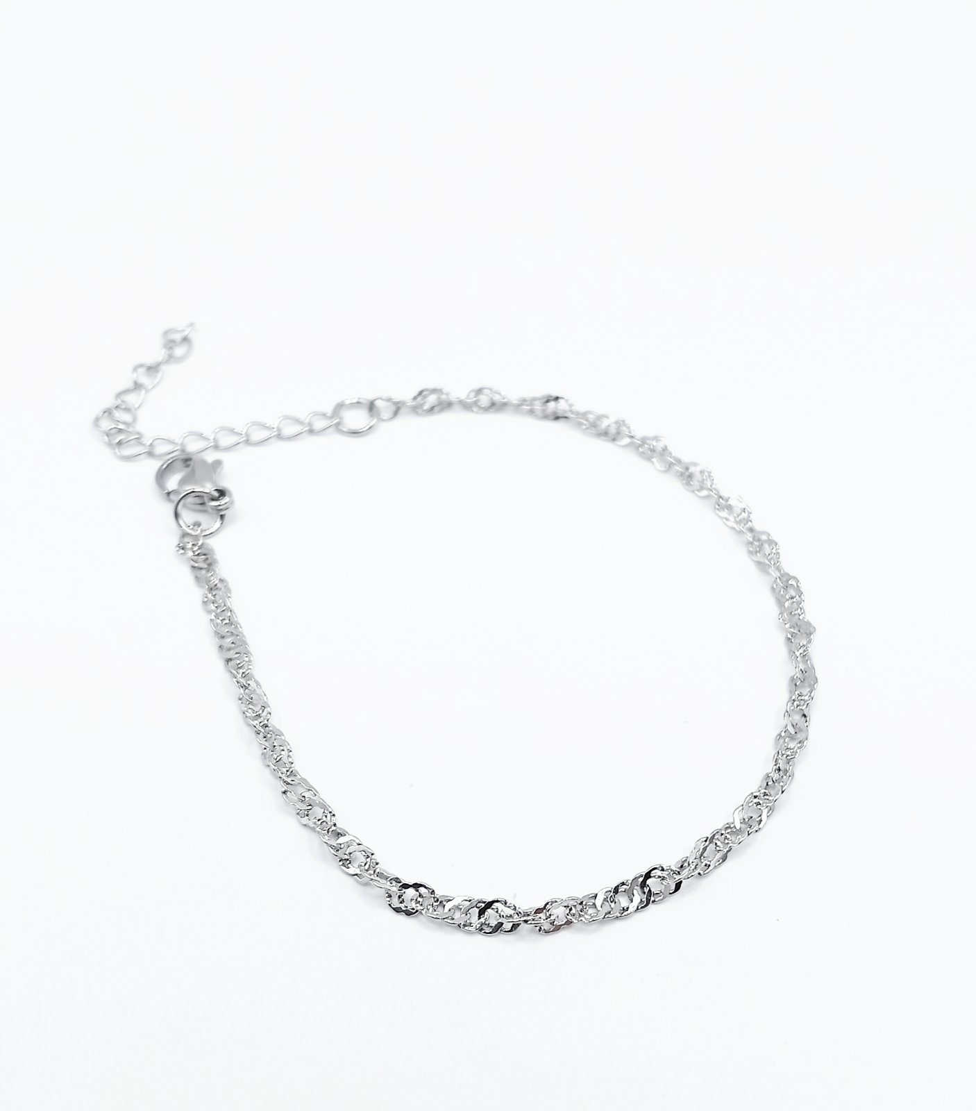 Το ασημί βραχιόλι-αλυσίδα από ανοξείδωτο ατσάλι συνδυάζει διακριτικότητα και κομψότητα με μια εκλεπτυσμένη λάμψη που δεν περνά απαρατήρητη. Οι μικροί, περίτεχνοι κρίκοι του δημιουργούν ένα παιχνιδιάρικο αποτέλεσμα που αντανακλά το φως όμορφα, προσδίδοντας μια διακριτική πολυτέλεια σε κάθε εμφάνιση.