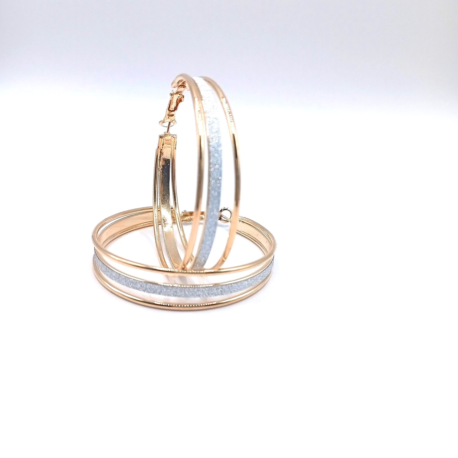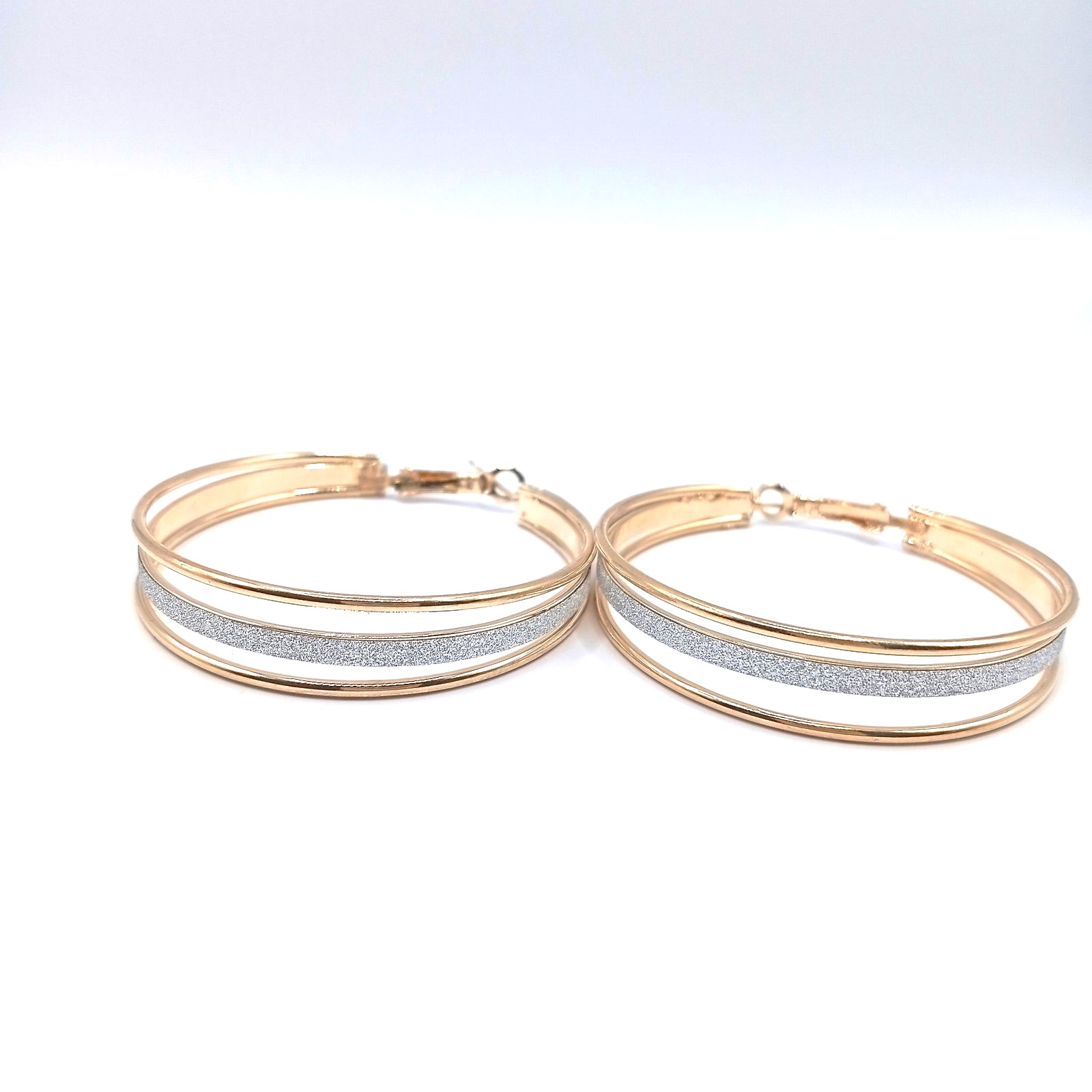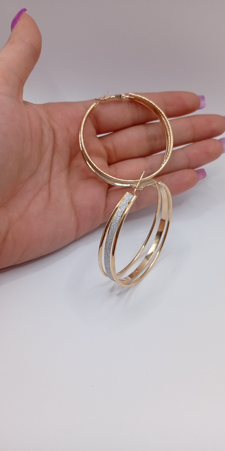 Αυτοί οι εντυπωσιακοί gold κρίκοι από ανοξείδωτο ατσάλι συνδυάζουν λαμπερή χρυσή απόχρωση με ασημί textured λωρίδα, δημιουργώντας ένα glamorous αποτέλεσμα που τραβάει το βλέμμα. Η μεγάλη διάμετρος των 5 εκ. τους δίνει έντονη παρουσία, ιδανική για βραδινές εμφανίσεις ή events όπου θέλεις να ξεχωρίσεις.