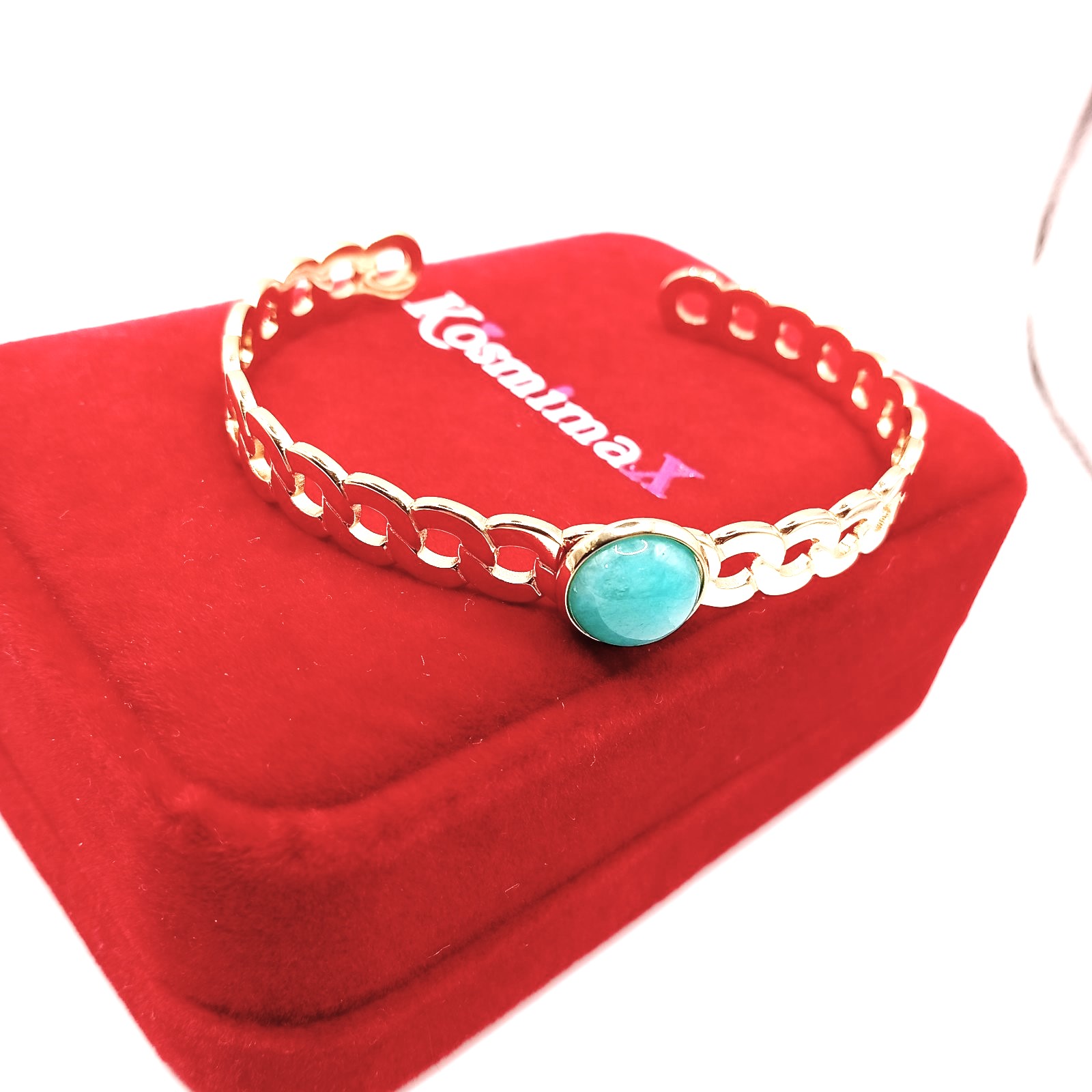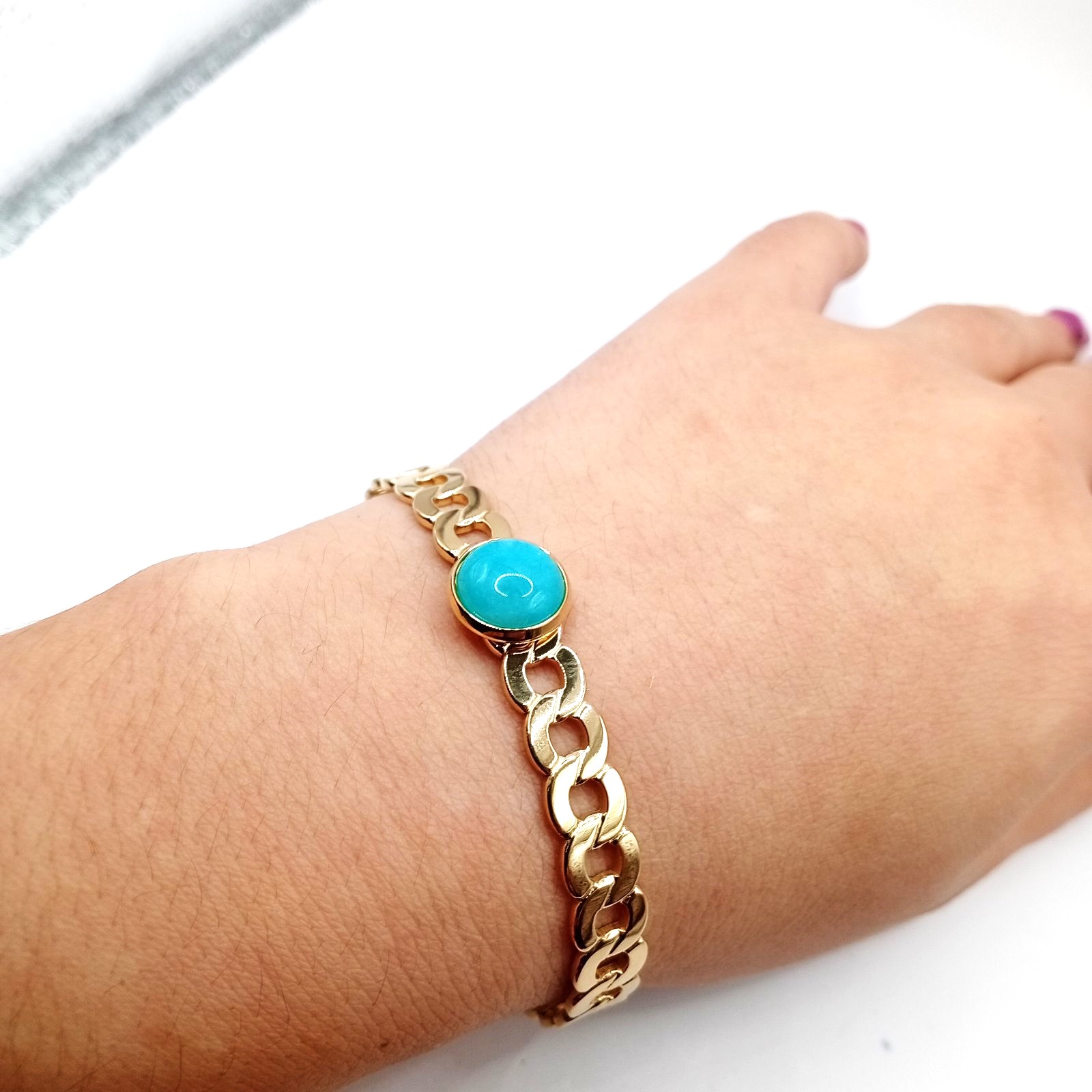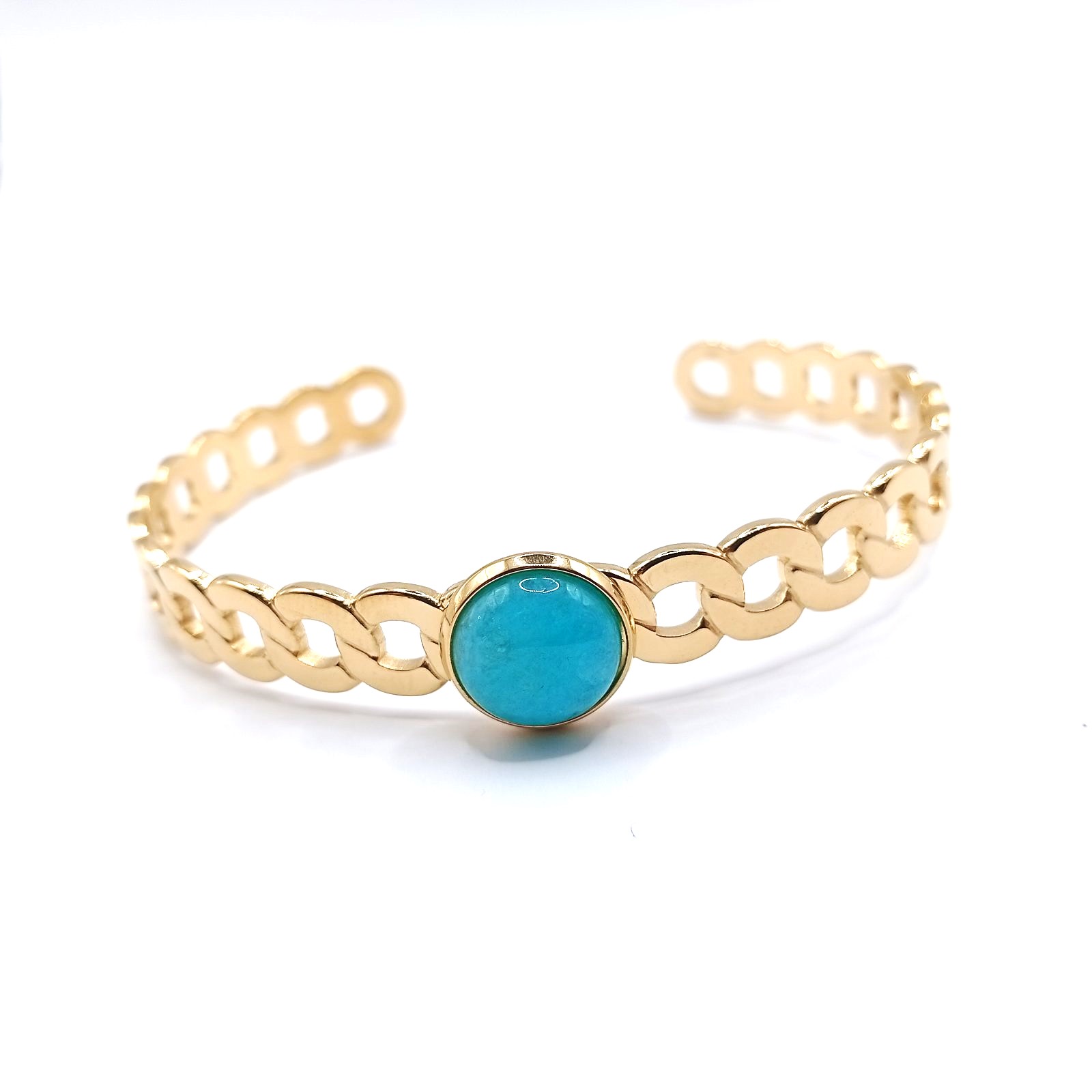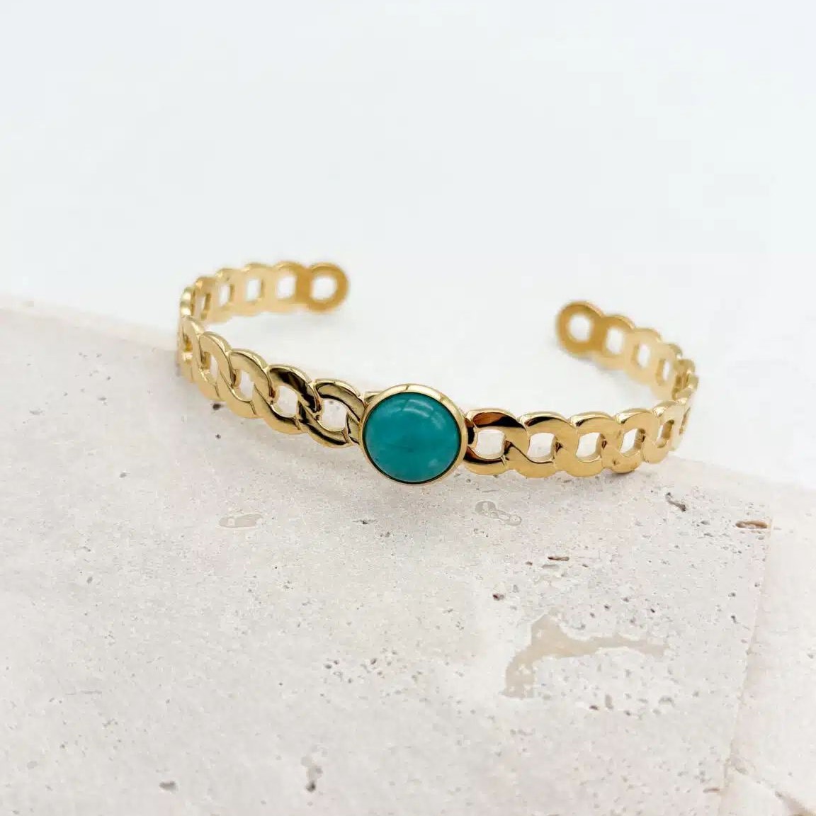 Κομψή γυναικεία χειροπέδα από επιχρυσωμένο ανοξείδωτο ατσάλι, με κεντρική τυρκουάζ πέτρα που δίνει χρώμα και προσωπικότητα σε κάθε εμφάνιση. Ανθεκτική, δεν μαυρίζει και δεν προκαλεί αλλεργίες.
