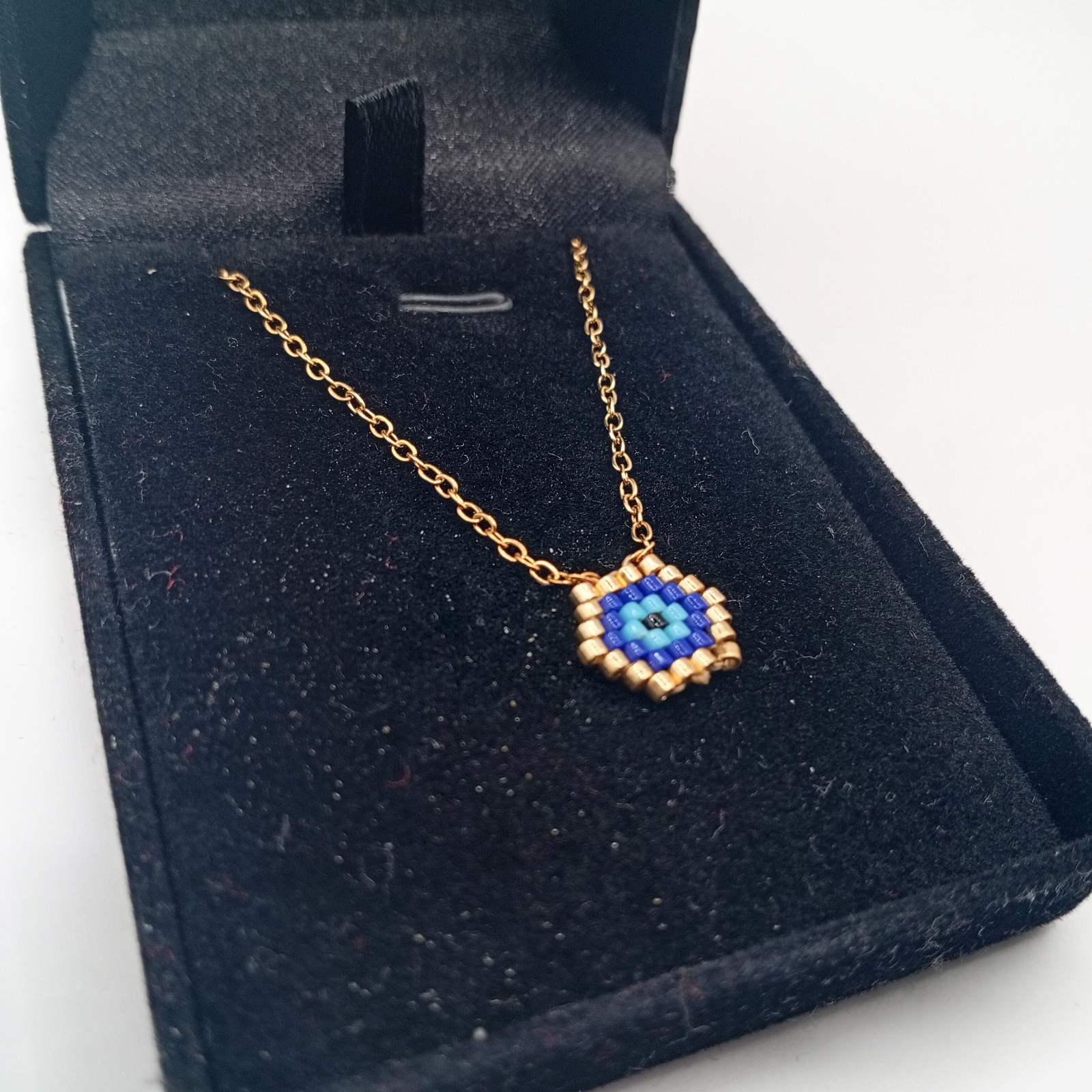Αυτό το χειροποίητο Miyuki κολιέ συνδυάζει τη λεπτομέρεια και την ακρίβεια των μικροσκοπικών χαντρών με ένα κλασικό μοτίβο «ματιού» σε μοντέρνα, εξαγωνική μορφή. Το στοιχείο έχει μέγεθος 11mm x 9mm, προσφέροντας μια διακριτική αλλά ευδιάκριτη λάμψη που ταιριάζει άψογα σε κάθε καθημερινό look.