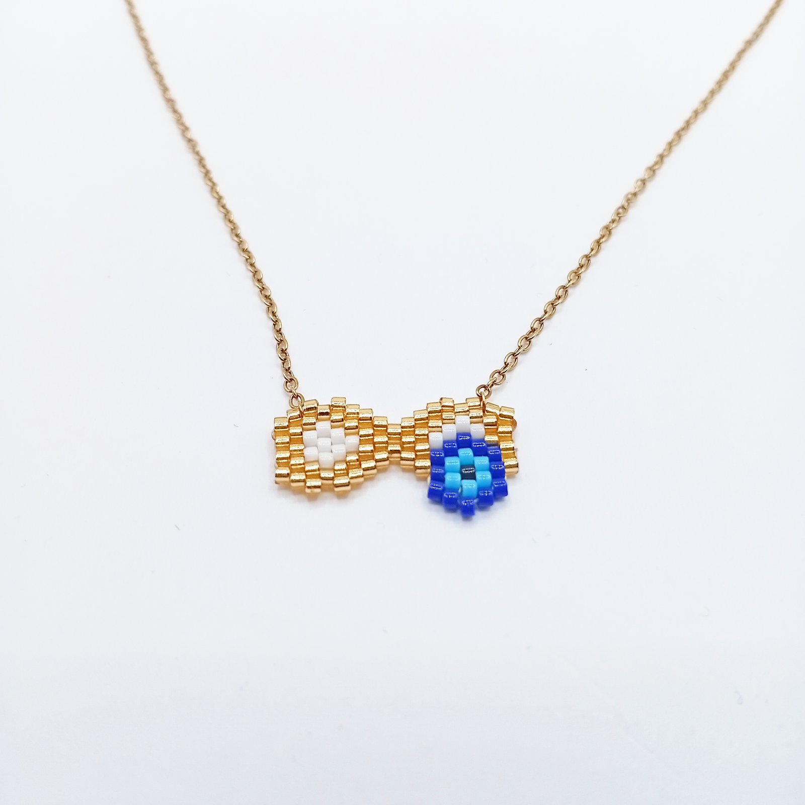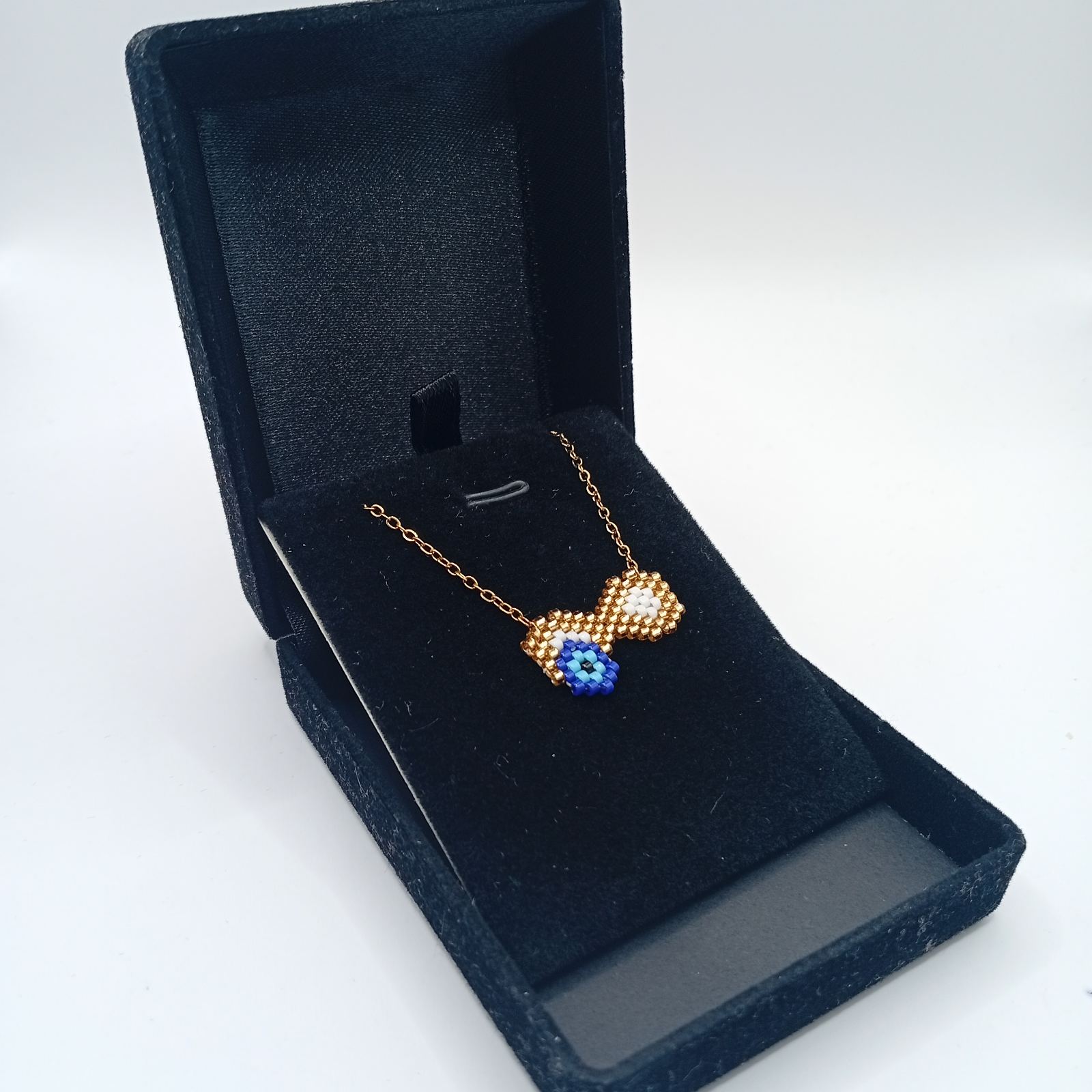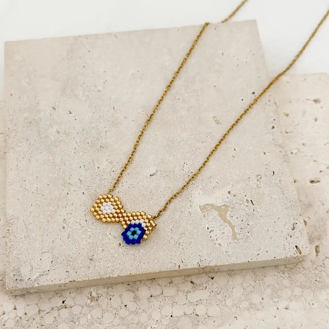 Ένα ιδιαίτερο Miyuki κολιέ που συνδυάζει δύο μικρά γεωμετρικά μοτίβα, με το ένα να σχηματίζει ένα μπλε «ματάκι» για προστασία και στυλ. Το χειροποίητο στοιχείο έχει μέγεθος 22mm x 13mm, προσφέροντας ακριβώς τη σωστή δόση λεπτομέρειας χωρίς να γίνεται υπερβολικό.