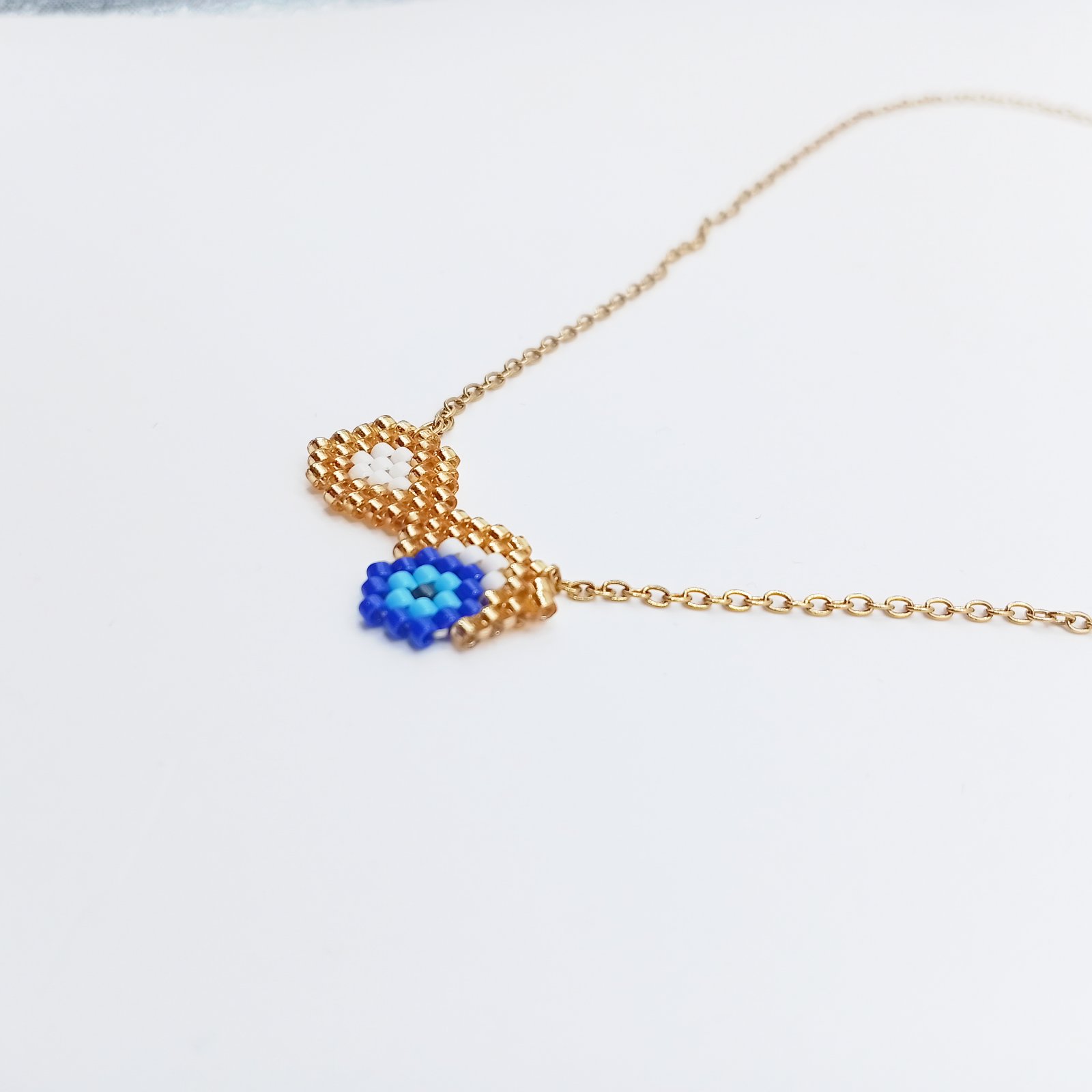 Ένα ιδιαίτερο Miyuki κολιέ που συνδυάζει δύο μικρά γεωμετρικά μοτίβα, με το ένα να σχηματίζει ένα μπλε «ματάκι» για προστασία και στυλ.Η επιχρυσωμένη αλυσίδα από ανοξείδωτο ατσάλι εξασφαλίζει ανθεκτικότητα, αντοχή στο νερό και υποαλλεργική χρήση, καθιστώντας το κατάλληλο για καθημερινή εφαρμογή χωρίς αλλοιώσεις.