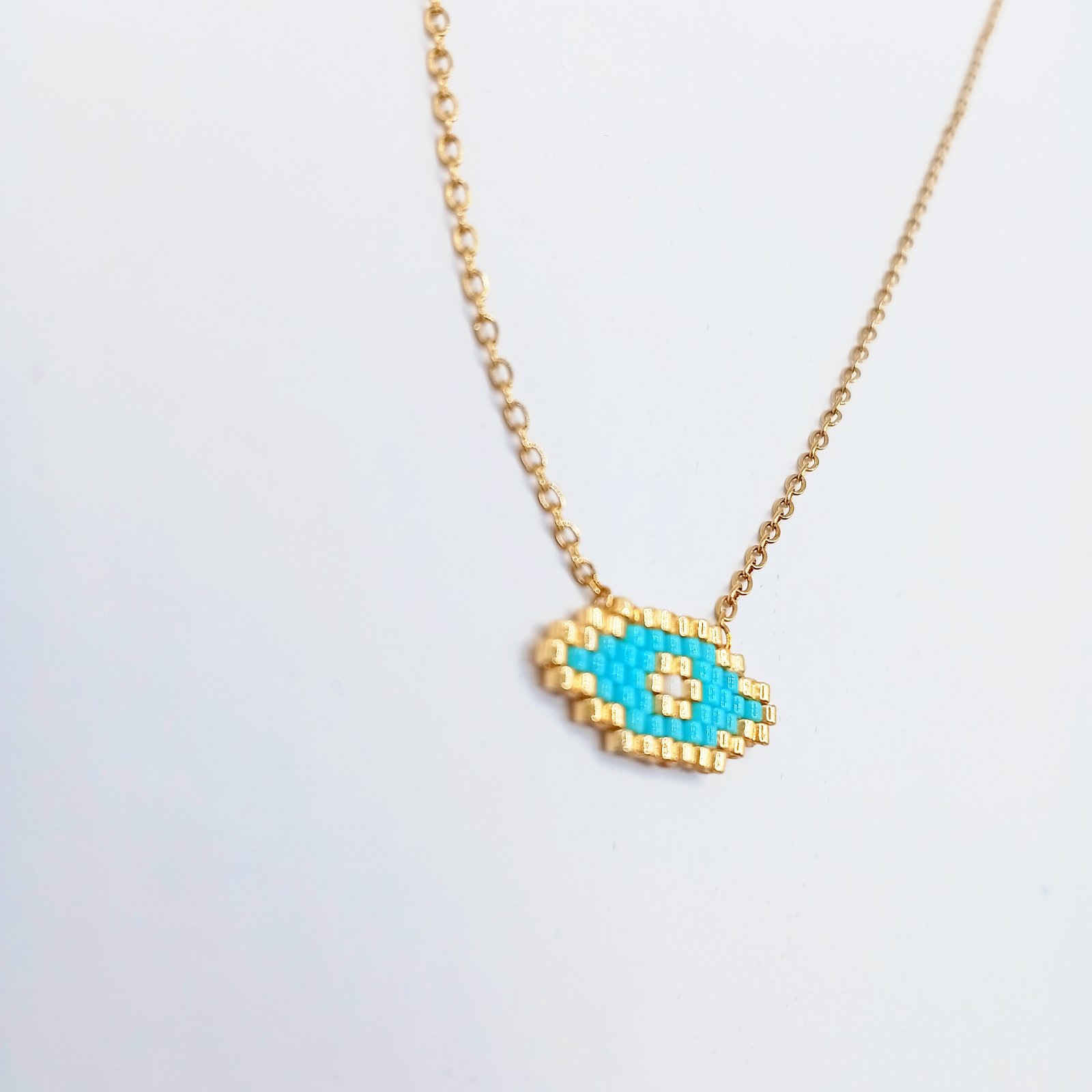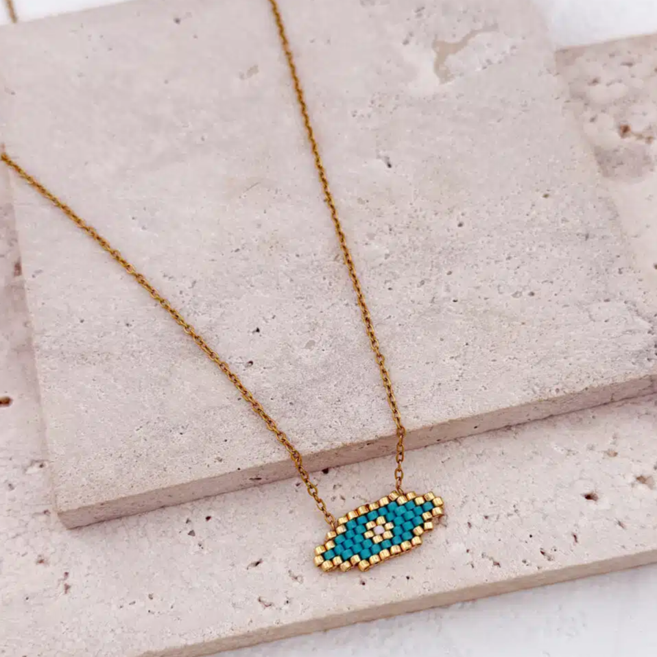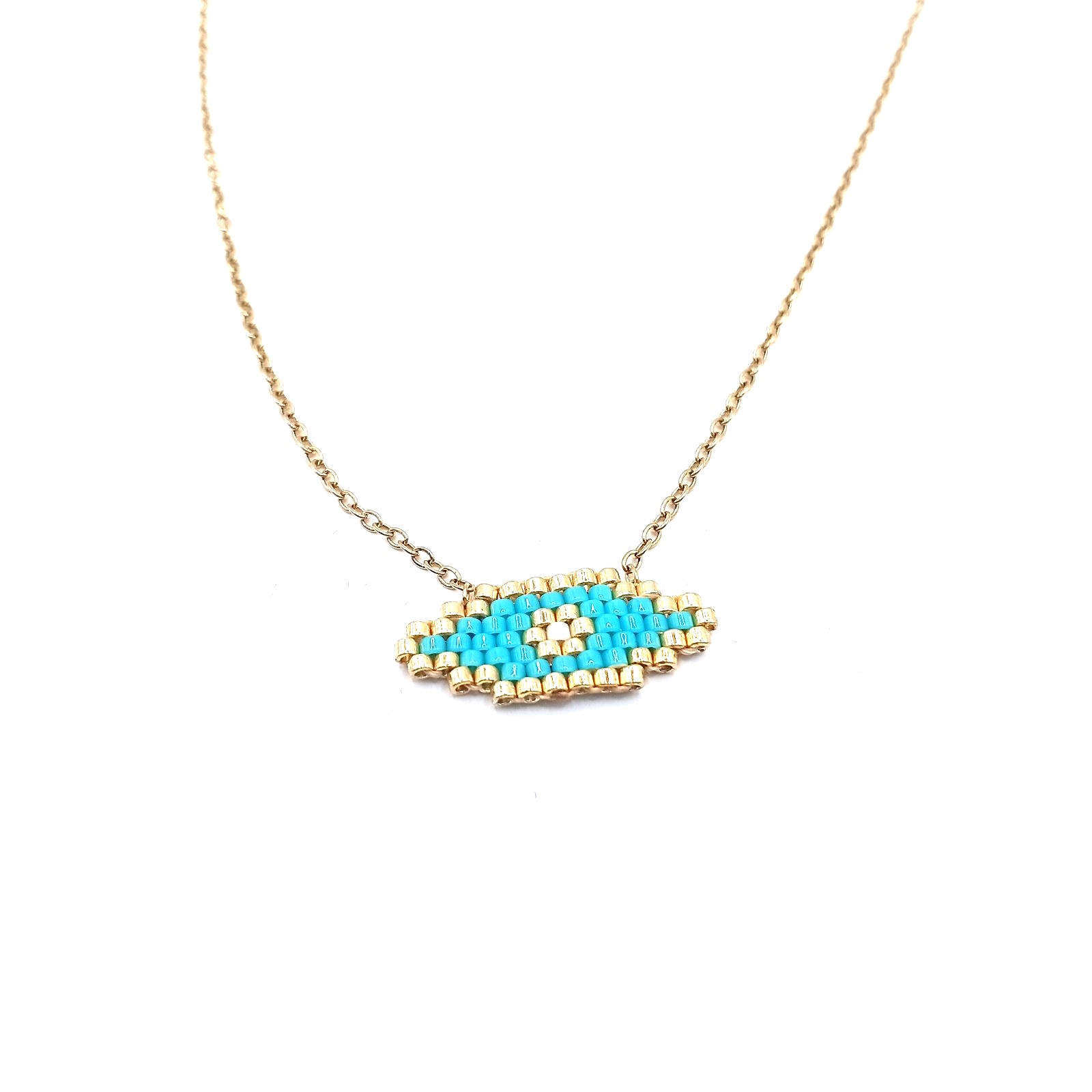 Αυτό το Miyuki κολιέ διαθέτει ένα χειροποίητο στοιχείο μεγέθους 22mm x 9mm, φτιαγμένο από υψηλής ποιότητας χάντρες σε ζωντανές τιρκουάζ αποχρώσεις, με διακριτικές λεπτομέρειες σε λευκό και χρυσό. Το σχήμα του είναι λεπτό και επίμηκες, που το κάνει να πέφτει όμορφα κατά μήκος του λαιμού και να ξεχωρίζει χωρίς να είναι υπερβολικό.