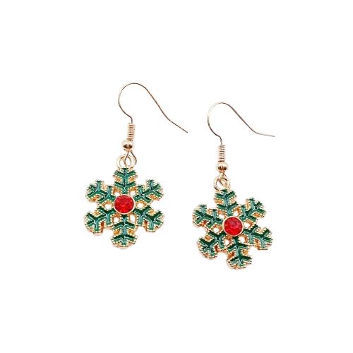 Αυτά τα χριστουγεννιάτικα σκουλαρίκια χιονονιφάδες σε ατσάλινους γάντζους είναι ένα εντυπωσιακό και λαμπερό κομμάτι που δίνει αμέσως γιορτινό χαρακτήρα σε κάθε εμφάνιση. Το κρεμαστό στοιχείο έχει πράσινες λεπτομέρειες που θυμίζουν χριστουγεννιάτικο στολισμό, ενώ η κόκκινη πέτρα στο κέντρο προσθέτει λάμψη και δημιουργεί μια όμορφη αντίθεση που τραβάει το βλέμμα.