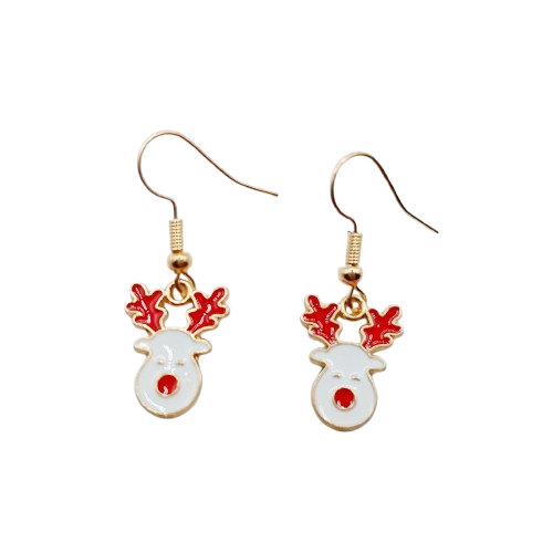 Αυτά τα χριστουγεννιάτικα σκουλαρίκια ελαφάκια σε ατσάλινους γάντζους είναι μια γλυκιά και παιχνιδιάρικη επιλογή για την εορταστική περίοδο. Το κρεμαστό στοιχείο συνδυάζει λευκές και κόκκινες αποχρώσεις, δημιουργώντας μια εικόνα που θυμίζει τον κλασικό Ρούντολφ με τη χαρακτηριστική κόκκινη μυτούλα και τα κόκκινα κέρατα.