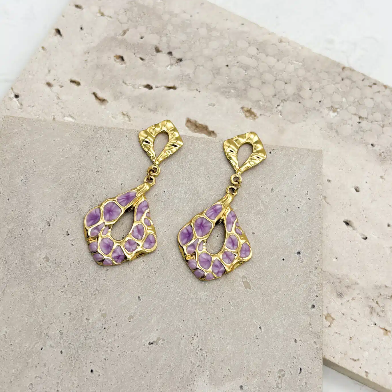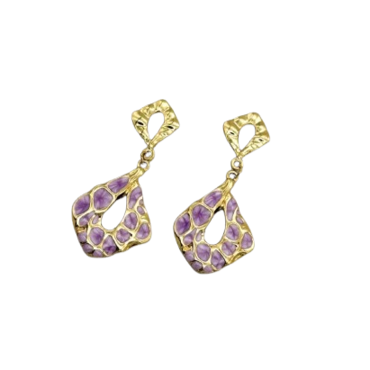 Αυτά τα εντυπωσιακά χρυσά κρεμαστά σκουλαρίκια συνδυάζουν μοντέρνο abstract σχεδιασμό με μωβ εμαγιέ στοιχεία που δίνουν ζωντάνια και προσωπικότητα. Η ανάγλυφη υφή τους προσθέτει βάθος και καλλιτεχνική διάθεση, ενώ το ιδιαίτερο σχήμα τα κάνει να ξεχωρίζουν σε κάθε εμφάνιση.