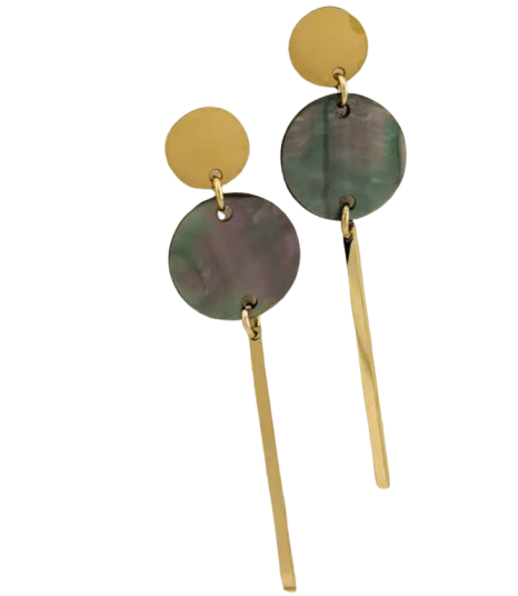 Το επάνω στοιχείο είναι ένα μικρό χρυσό δίσκο, ενώ το κρεμαστό μέρος αποτελείται από μια εντυπωσιακή mother of pearl ροδέλα και μια λεπτή, επιμήκη χρυσή ράβδο που προσθέτει κίνηση και μοντέρνα αισθητική. Παρότι έχουν statement εμφάνιση, τα σκουλαρίκια είναι ελαφριά και άνετα, ιδανικά για πολύωρη χρήση.