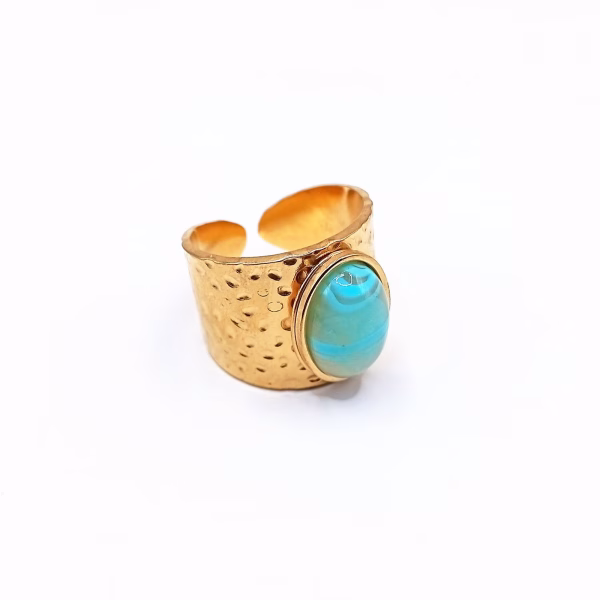 Ένα δυναμικό statement δαχτυλίδι που ξεχωρίζει για τη σφυρήλατη υφή του και την έντονη χρωματική αντίθεση της γαλάζιας πέτρας. Η επιχρυσωμένη επιφάνεια από ανοξείδωτο ατσάλι δημιουργεί ένα ζεστό, πολυτελές αποτέλεσμα, ενώ η οβάλ πέτρα προσθέτει χαρακτήρα και βάθος στο σχέδιο.