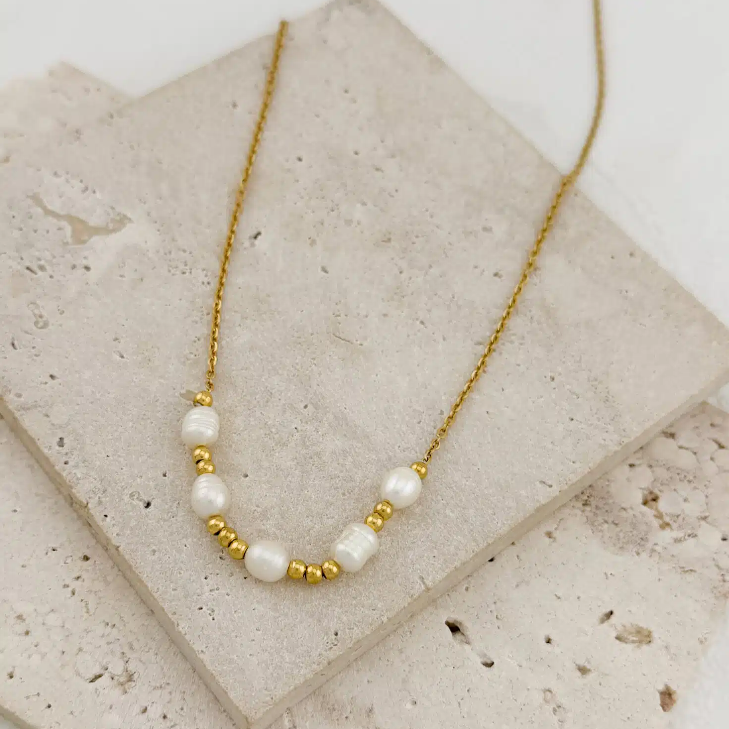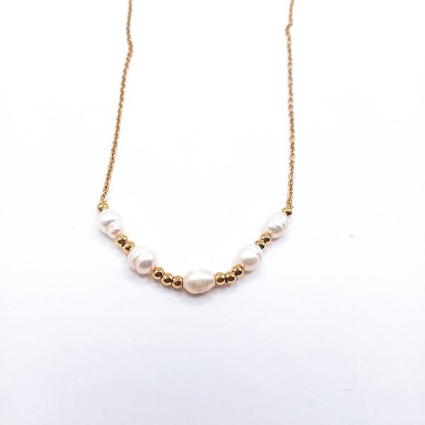 Κολιέ από ανοξείδωτο ατσάλι, επιχρυσωμένο, με λευκές πέρλες και μικρές χρυσές χάντρες. Κομψό, φωτεινό και ιδανικό για καθημερινά ή πιο elegant looks.