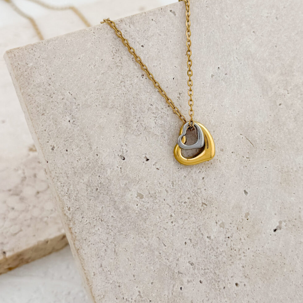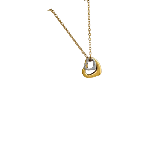 Ένα ξεχωριστό κολιέ που συνδυάζει αρμονικά δύο τόνους μετάλλου, προσφέροντας ευκολία στο ταίριασμα με οποιοδήποτε άλλο κόσμημα. Το μενταγιόν αποτελείται από δύο καρδιές σε ελεύθερη, μοντέρνα φόρμα: η εξωτερική σε επιχρυσωμένο ατσάλι και η εσωτερική σε ασημί τόνο, δημιουργώντας έναν elegant συνδυασμό.