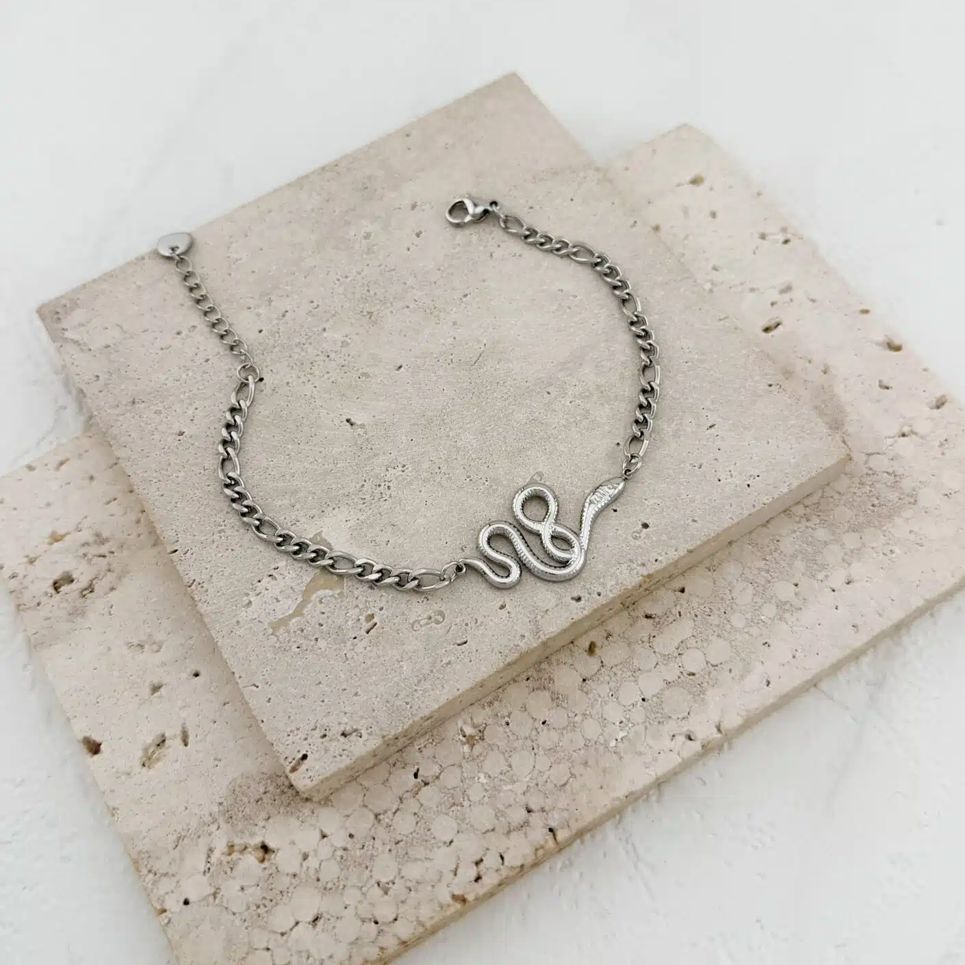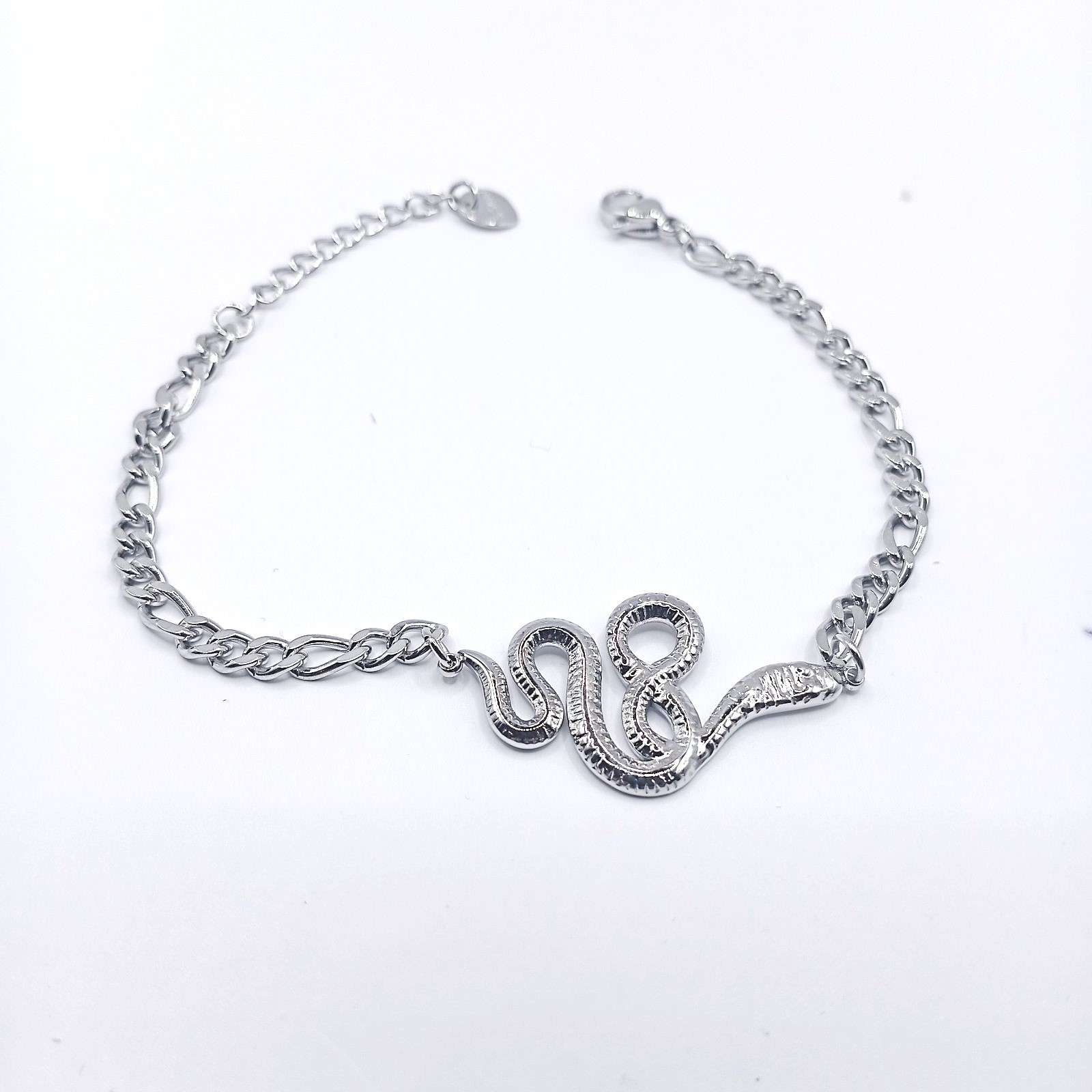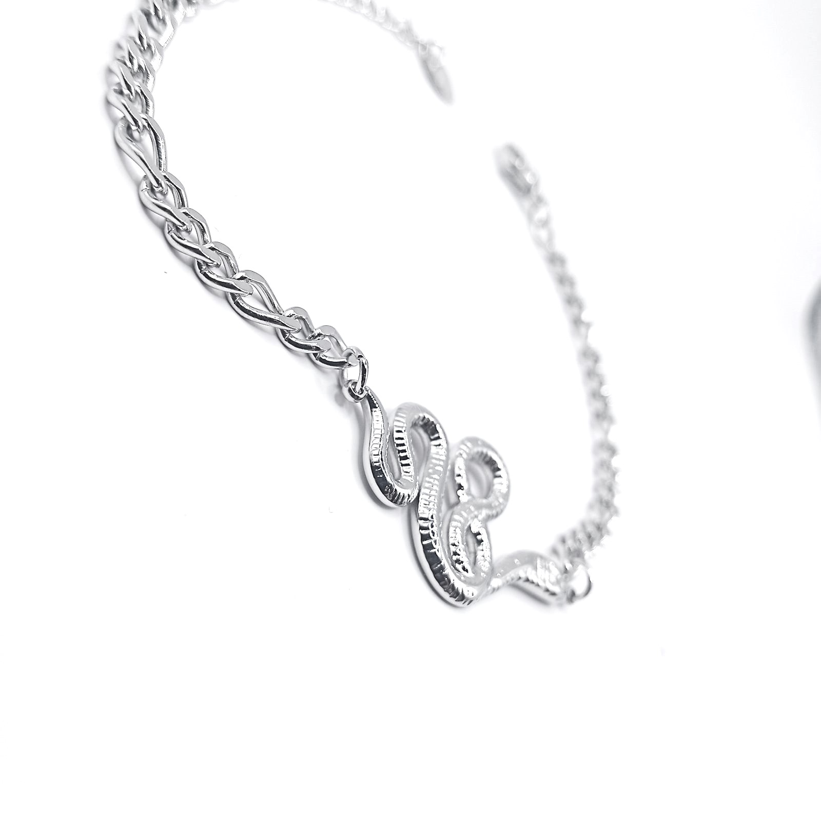 Αυτό το silver βραχιόλι συνδυάζει δυναμισμό και κομψότητα μέσα από το elegant μοτίβο φιδιού που αποτελεί το κεντρικό του στοιχείο. Το φίδι έχει λεπτομερή ανάγλυφη υφή, προσθέτοντας βάθος και ιδιαίτερο χαρακτήρα στο κόσμημα. Η ασημί αλυσίδα ισορροπεί το design, κρατώντας το minimal αλλά εντυπωσιακό.