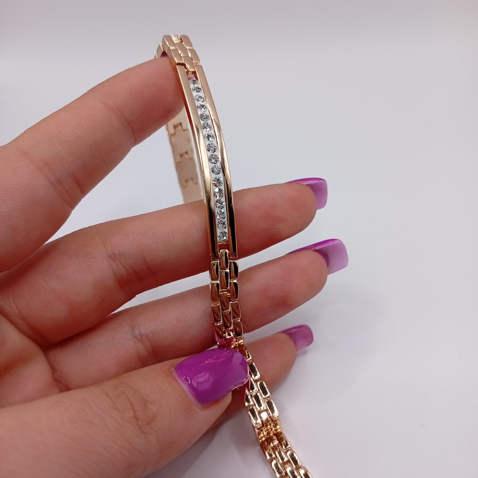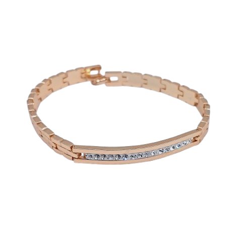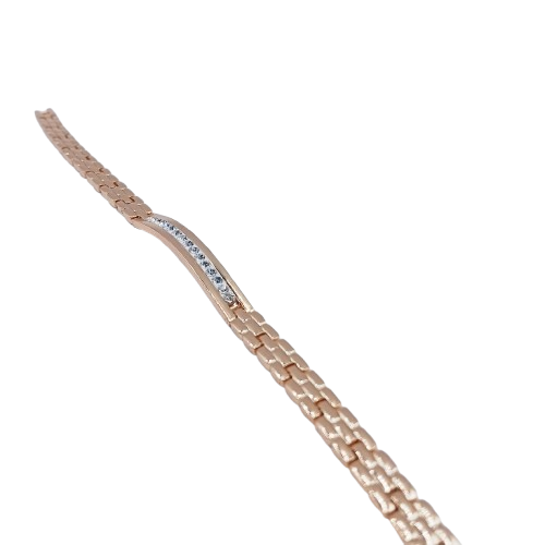 Γυναικείο βραχιόλι από ανοξείδωτο ατσάλι σε εντυπωσιακό ροζ gold χρώμα, με μήκος 22 εκ., σχεδιασμένο για άνετη και σταθερή εφαρμογή. Η λεπτή μπροστινή μπάρα είναι στολισμένη με λαμπερά ζιρκόν, προσφέροντας κομψότητα και διακριτική λάμψη που ταιριάζει σε κάθε look, από casual μέχρι πιο επίσημο.