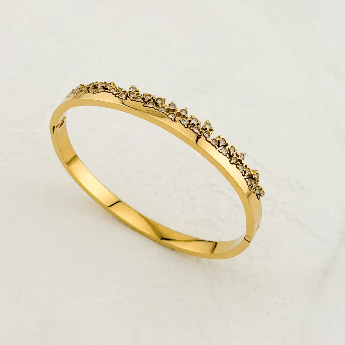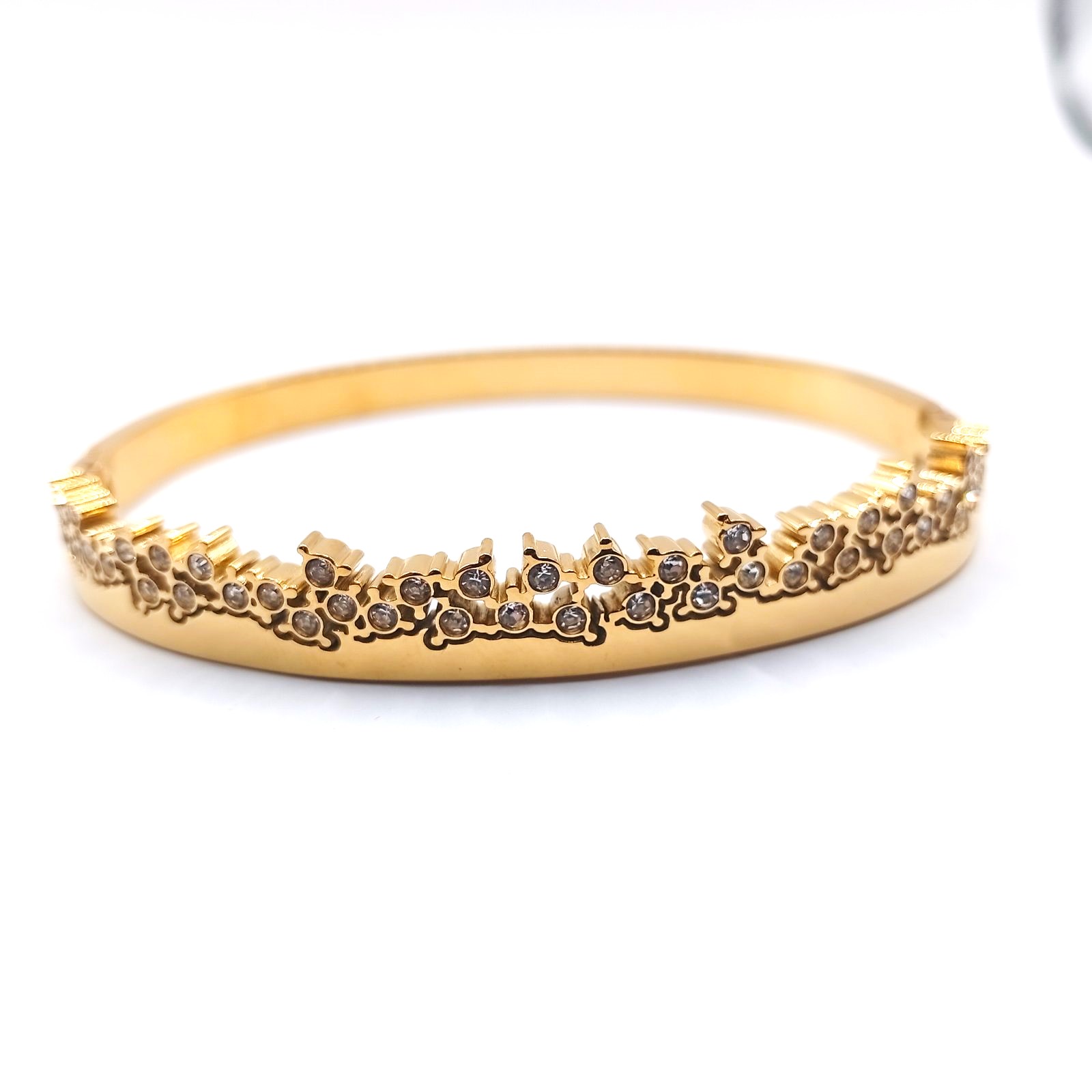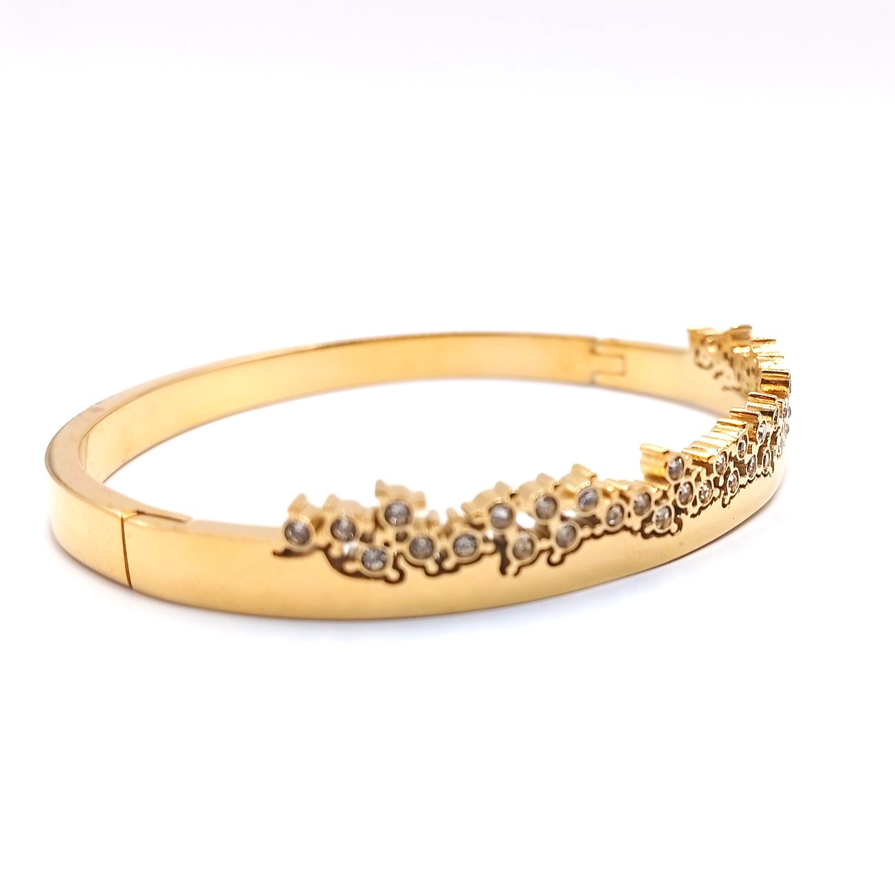 Αυτό το γυναικείο cuff βραχιόλι ξεχωρίζει χάρη στο πανέμορφο floral ανάγλυφο μοτίβο του. Τα μικρά λουλούδια που στολίζουν την επάνω πλευρά δημιουργούν μια ιδιαίτερα θηλυκή και κομψή εικόνα, ιδανική για όσες αγαπούν τα κοσμήματα με λεπτομέρεια και προσωπικότητα. Η γυαλιστερή επιφάνεια του επιχρυσωμένου ατσαλιού προσφέρει διακριτική αλλά σταθερή λάμψη, κάνοντάς το κατάλληλο τόσο για καθημερινή χρήση όσο και για πιο επίσημες περιστάσεις.