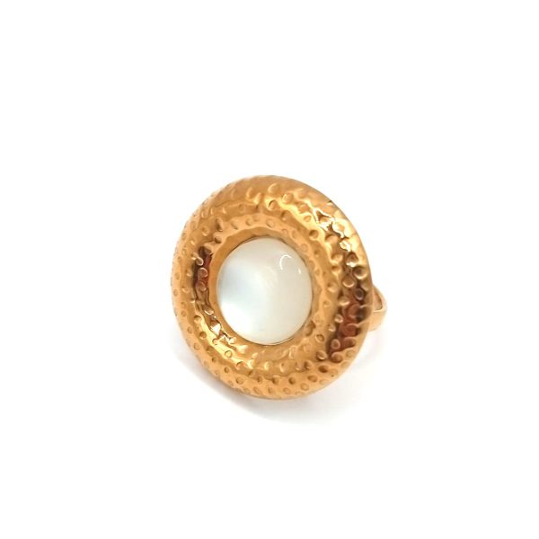 Αυτό το εντυπωσιακό γυναικείο δαχτυλίδι από επιχρυσωμένο ανοξείδωτο ατσάλι συνδυάζει μοντέρνα αισθητική και διαχρονική κομψότητα. Το σφυρήλατο κυκλικό σχέδιο δημιουργεί μια πανέμορφη υφή που παίζει με το φως, ενώ στο κέντρο δεσπόζει μια λευκή περλέ καμποσόν χάντρα, χαρίζοντας μια απαλή και κομψή λάμψη σε κάθε κίνηση.