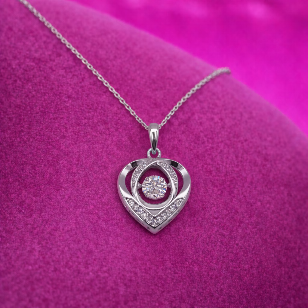 Ένα κομψό και διαχρονικό κόσμημα που αναδεικνύει τη θηλυκότητα και τη λάμψη. Το γυναικείο κολιέ διαθέτει μενταγιόν σε σχήμα καρδιάς, διακοσμημένο με μικρές λαμπερές πέτρες και μία κεντρική πέτρα Moissanite 1 καρατίου, η οποία χαρίζει εντυπωσιακή φωτεινότητα.