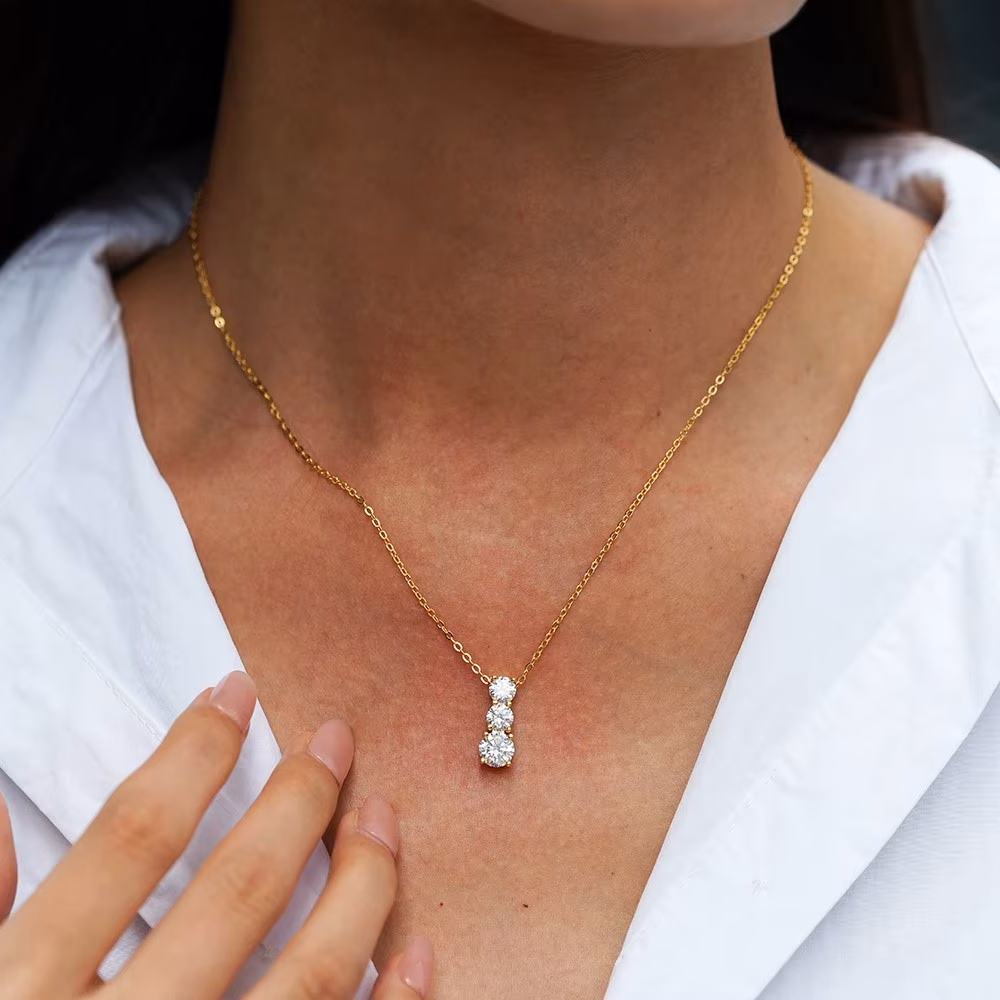 Ένα κομψό και σύγχρονο ασημένιο κολιέ που ξεχωρίζει για τον σχεδιασμό και τη λάμψη του. Το κόσμημα είναι κατασκευασμένο από ασήμι 925, επιχρυσωμένο με 18k χρυσό, και διακοσμημένο με τρεις πέτρες Μοϊσανίτη (Moissanite) σε κάθετη διάταξη, συνολικού βάρους 1,8 καρατίων.